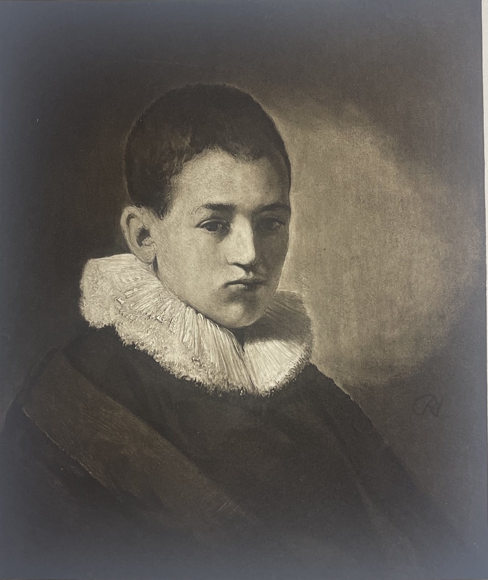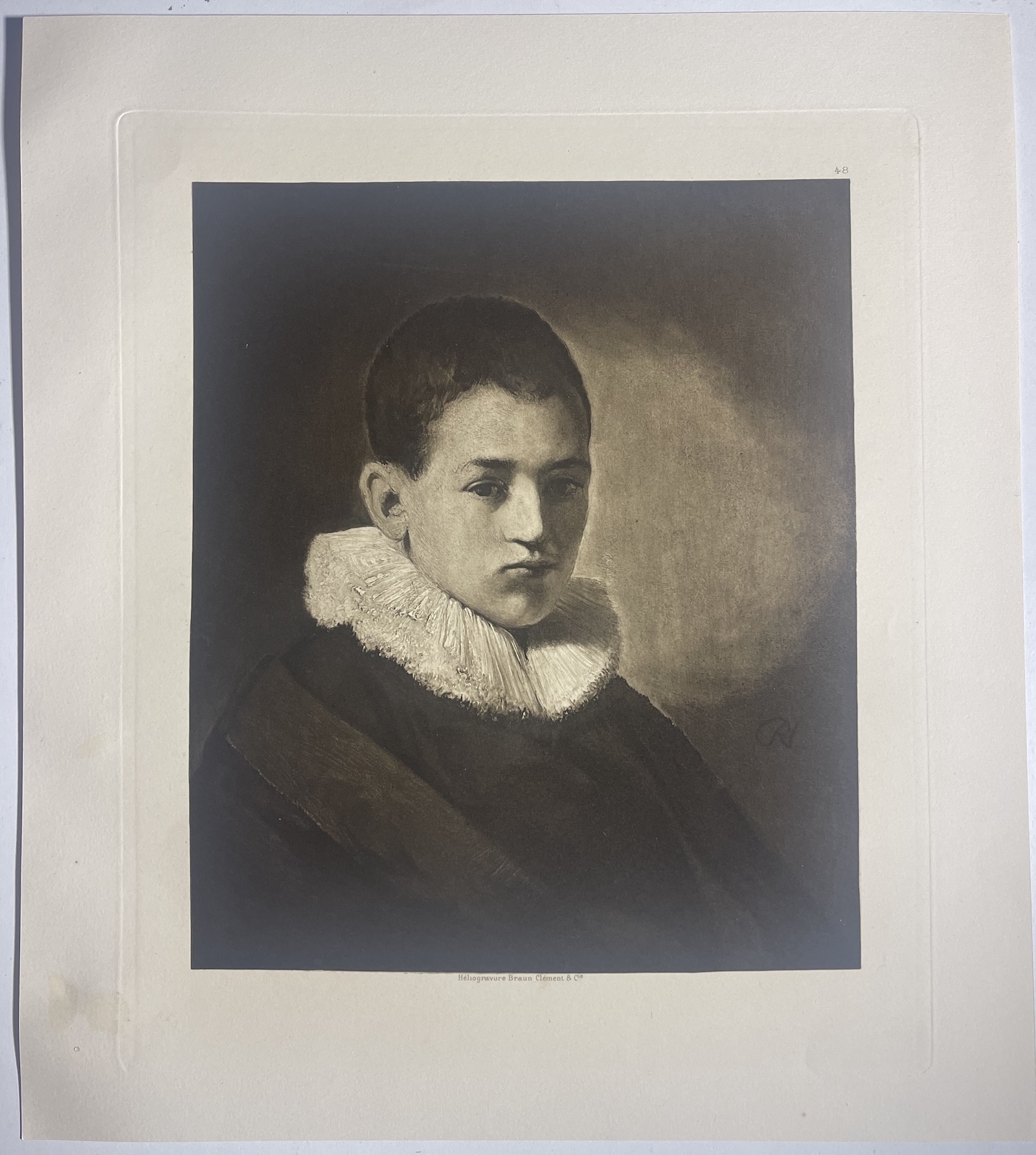 Belle héliogravure d’après Rembrandt représentant le portrait d’un adolescent, éditée par Braun, Clément & Cie en 1898. Cette estampe reproduit une œuvre du grand maître hollandais Rembrandt van Rijn (1606-1669), l’un des plus importants peintres et graveurs du XVIIᵉ siècle. La qualité du tirage met particulièrement en valeur les nuances et les contrastes caractéristiques de la peinture du maître. Les éditions Braun, Clément & Cie, célèbres à la fin du XIXᵉ siècle, étaient reconnues pour la finesse de leurs héliogravures destinées à diffuser les œuvres des grands musées européens et des maîtres anciens. Dimensions de la feuille : 33,3 cm × 29,7 cm. Dimensions de la gravure : 23,4 cm × 19,7 cm. Belle épreuve ancienne aux tonalités profondes et au rendu très précis, typique des héliogravures Braun de la fin du XIXᵉ siècle.