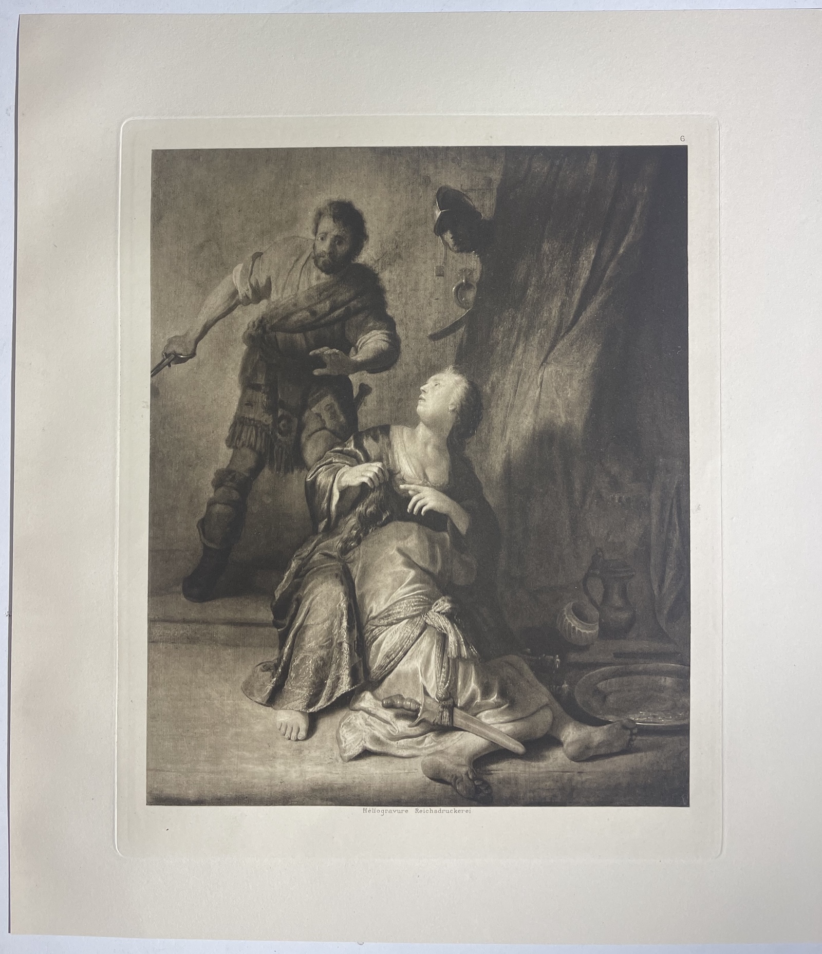 Belle héliogravure ancienne d’après Rembrandt van Rijn (1606-1669) représentant Samson et Dalila, célèbre épisode biblique tiré du Livre des Juges. La scène montre le moment dramatique où Dalila trahit Samson en permettant à ses ennemis de lui couper les cheveux, source de sa force légendaire. Rembrandt traite ce sujet avec une intensité remarquable grâce à son célèbre clair-obscur, concentrant la lumière sur les personnages principaux tandis que les figures secondaires émergent de l’ombre. La composition renforce la tension dramatique de l’instant et illustre parfaitement la puissance narrative de la peinture hollandaise du XVIIᵉ siècle.