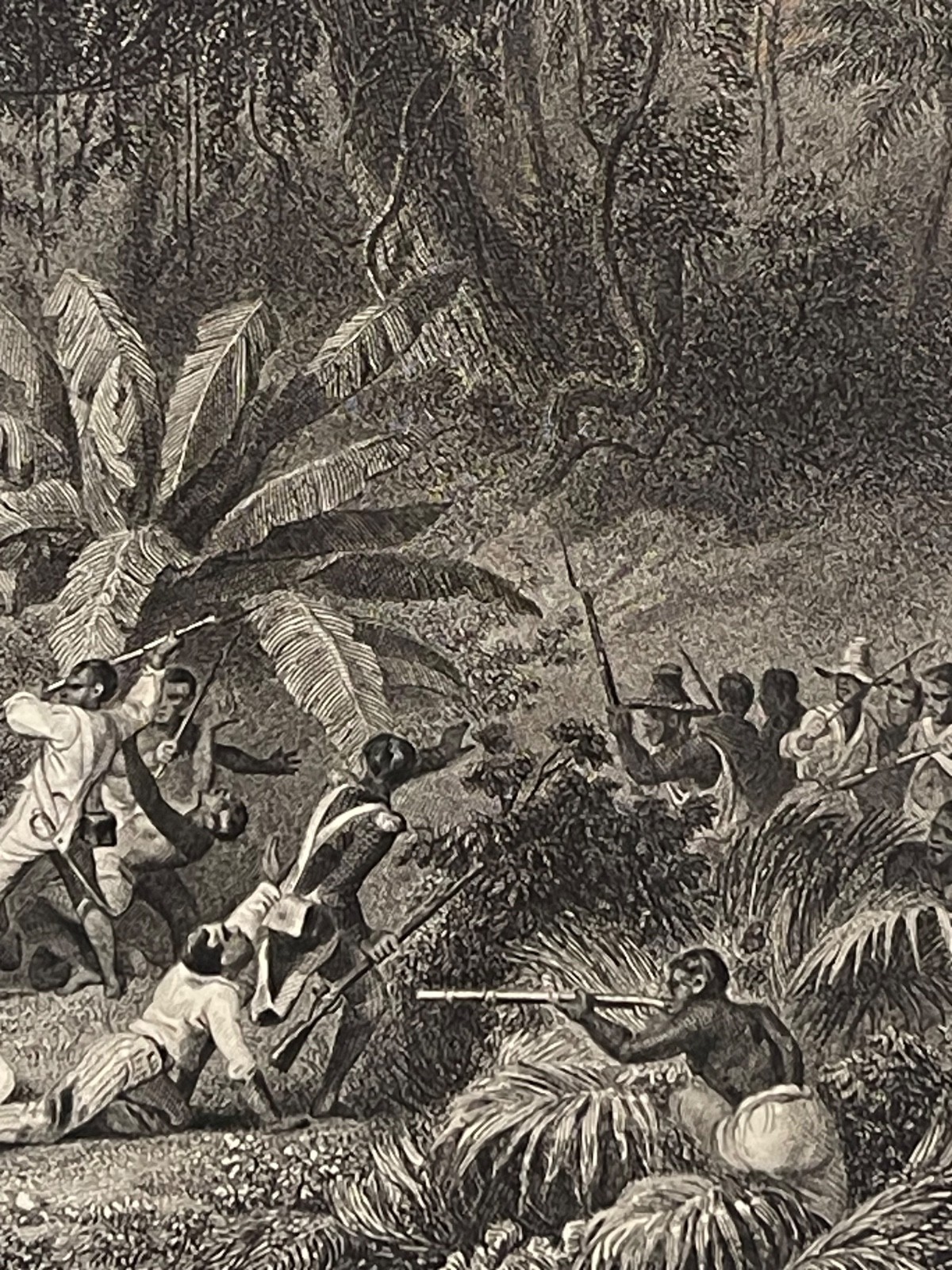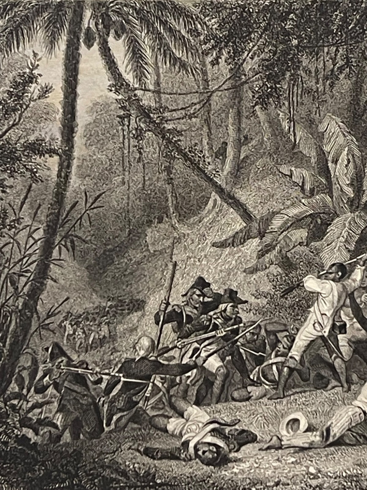 Je vous propose cette gravure vers 1836 illustrant une scène de bataille à Saint-Domingue (Haïti) en 1802, dans le contexte du rétablissement de l’esclavage par la France et des combats qui s’ensuivirent.