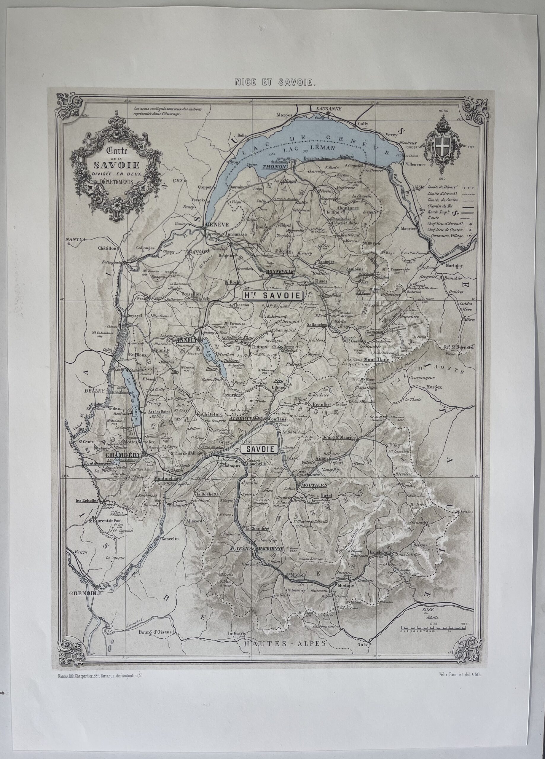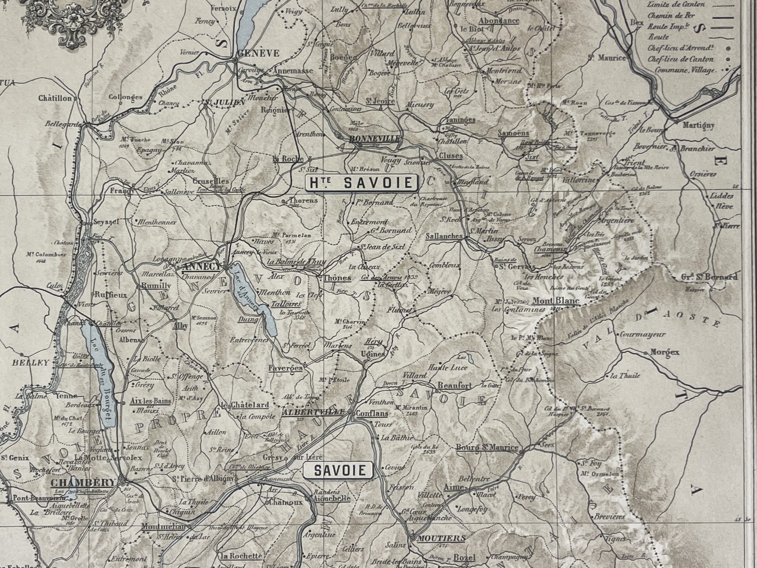 Cette lithographie offre une lecture détaillée du territoire savoyard peu après son rattachement à la France (1860), avec une représentation précise des villes, routes, reliefs et limites administratives. Le lac Léman, les axes de communication et les principales localités y sont clairement identifiés.
