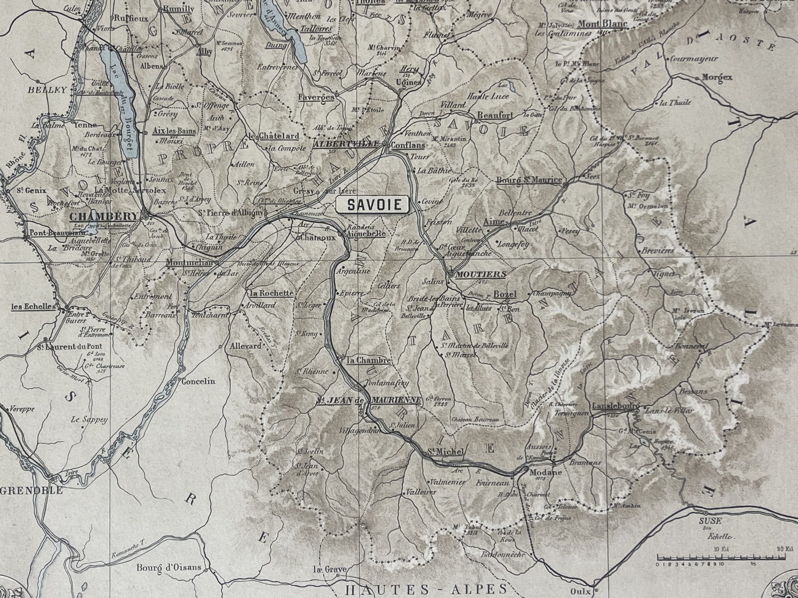 Je vous propose cette grande lithographie ancienne représentant Grande carte ancienne représentant la Savoie divisée en deux départements, réalisée en 1864.