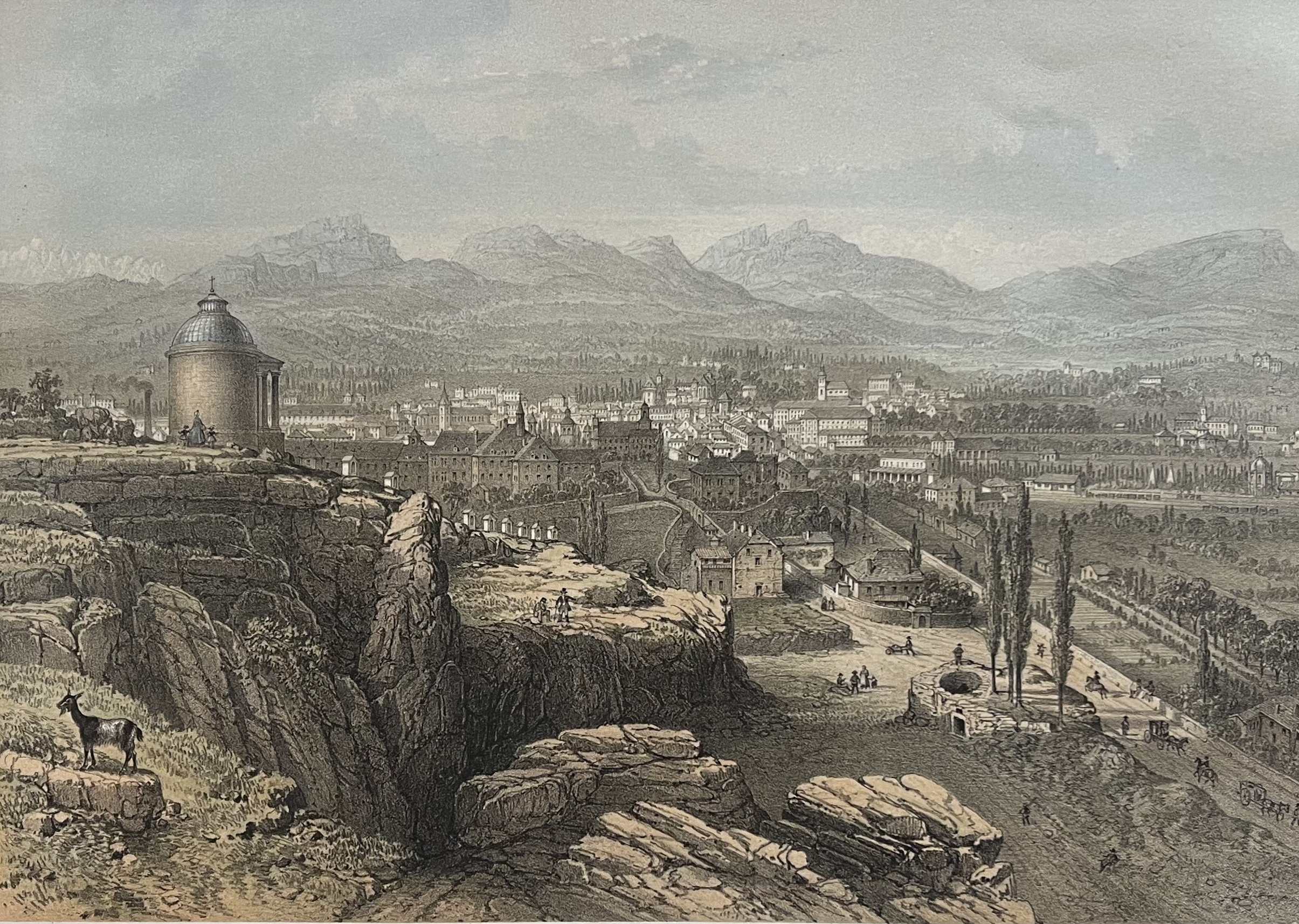 La composition est particulièrement raffinée : au premier plan, un promontoire rocheux et une rotonde encadrent la scène, tandis que la ville se déploie en contrebas avec une grande précision architecturale. Avenues arborées, bâtiments et chaînes de montagnes au loin créent une perspective en plans superposés d’une profondeur remarquable. Des personnages et des animaux animent subtilement le paysage, lui conférant vie et échelle, une caractéristique de l’œuvre de Benoist. Imprimée sur papier vélin, la lithographie présente de délicates gradations de tons rehaussées d’une légère coloration à la main, accentuant à la fois le réalisme et l’attrait décoratif. La feuille fait: 47,5 cm × 31,5 cm, la gravure seule fait : 31,3 cm × 22 cm Pièce de collection très recherchée et décorative, idéale pour les collectionneurs de vues de villes françaises, d’histoire de la Savoie et de paysages alpins.