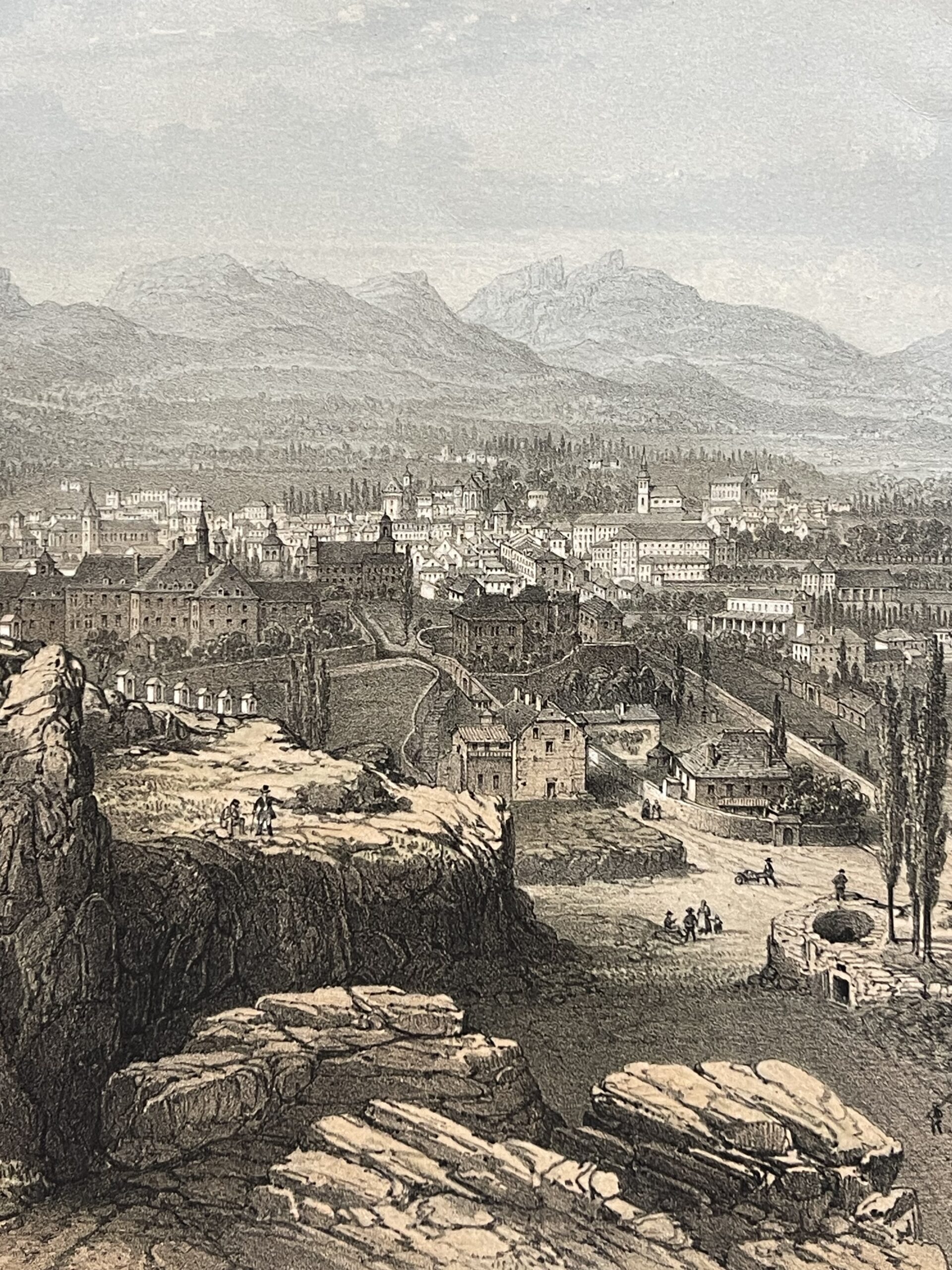 Je vous propose cette lithographie originale du XIXe siècle qui représente Chambéry, capitale historique de la Savoie, vue panoramique depuis Lémenc, dominant la ville et le paysage alpin environnant.
