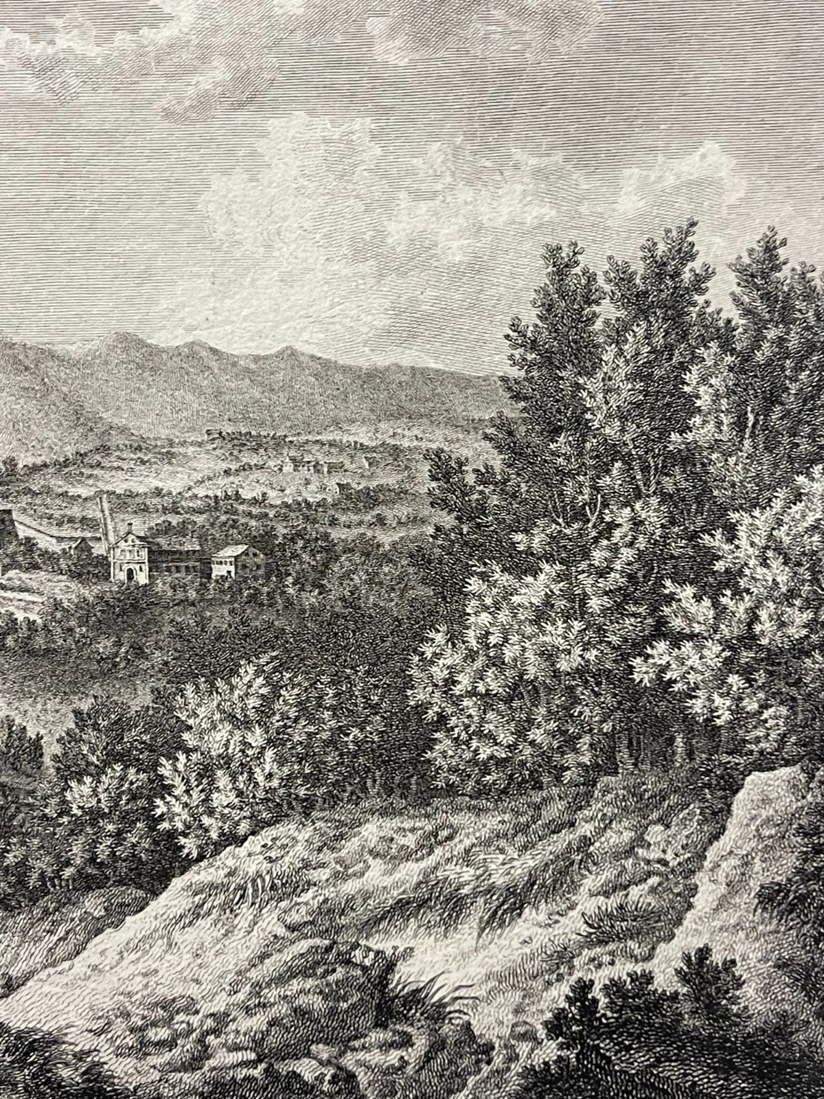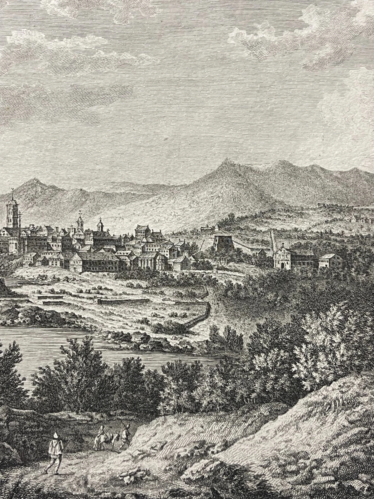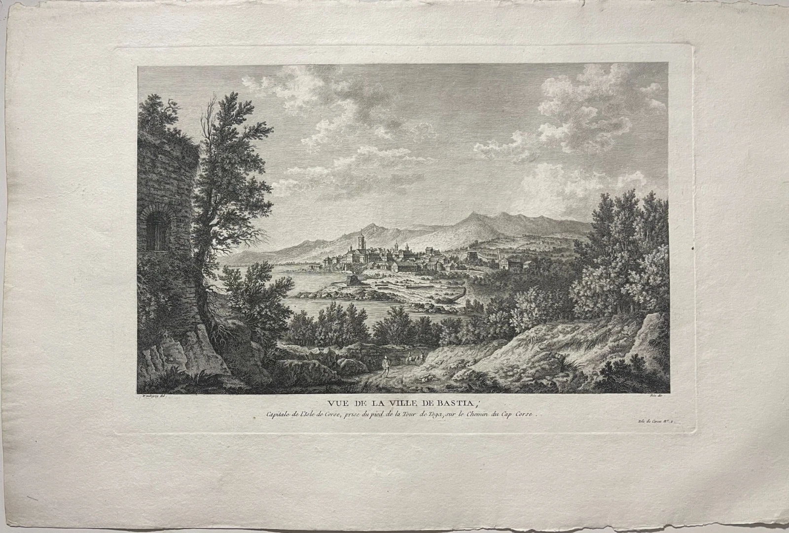 Cette composition élégante et parfaitement construite est réalisée d’après Daubigny, témoigne du goût pour les paysages pittoresques et les vues topographiques à la fin du XVIIIe siècle. La scène déploie une perspective remarquable : au premier plan, un terrain accidenté animé de personnages, puis la baie et la ville de Bastia, dominée par ses édifices et ses fortifications, enfin les reliefs montagneux corses en arrière-plan.