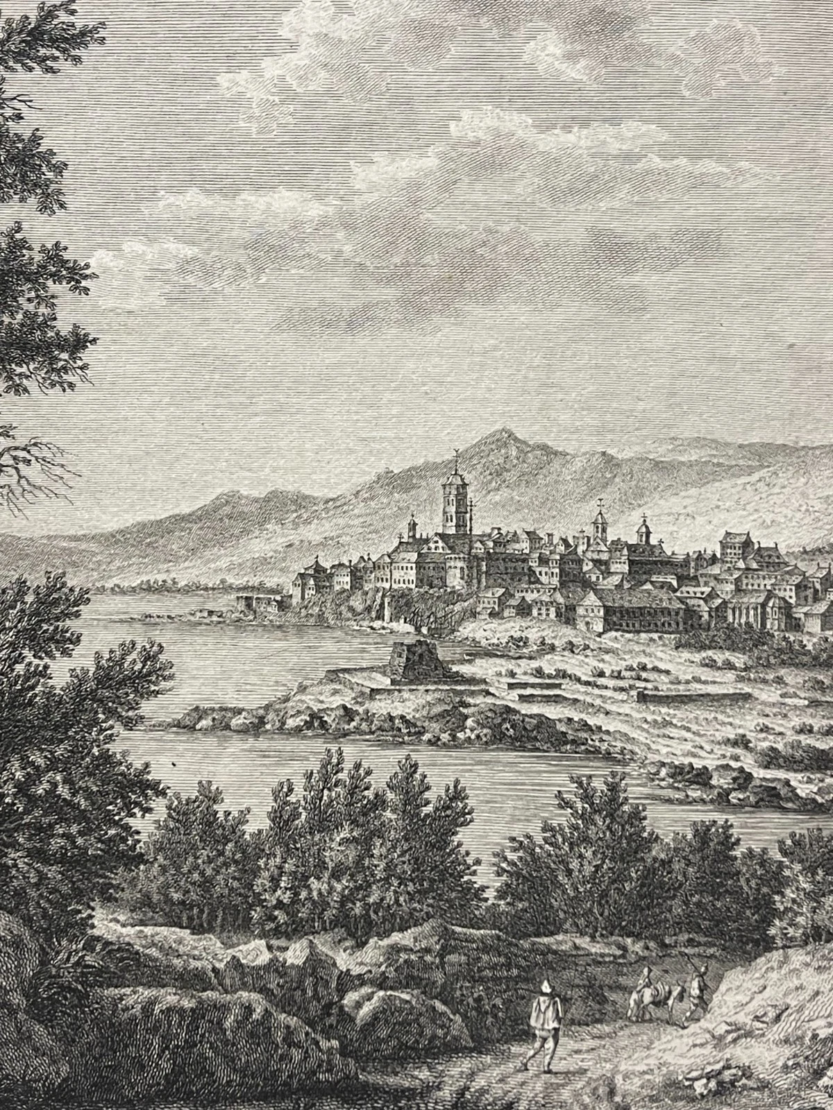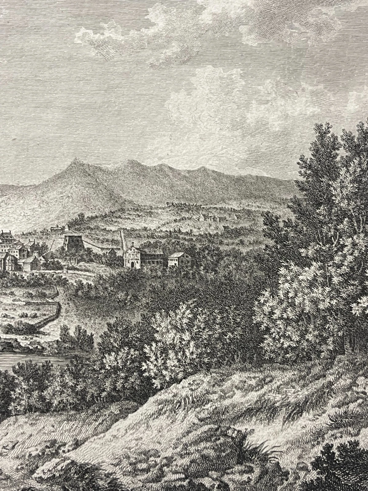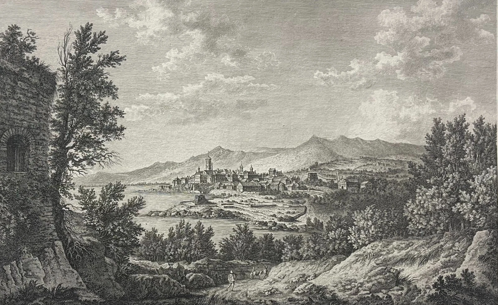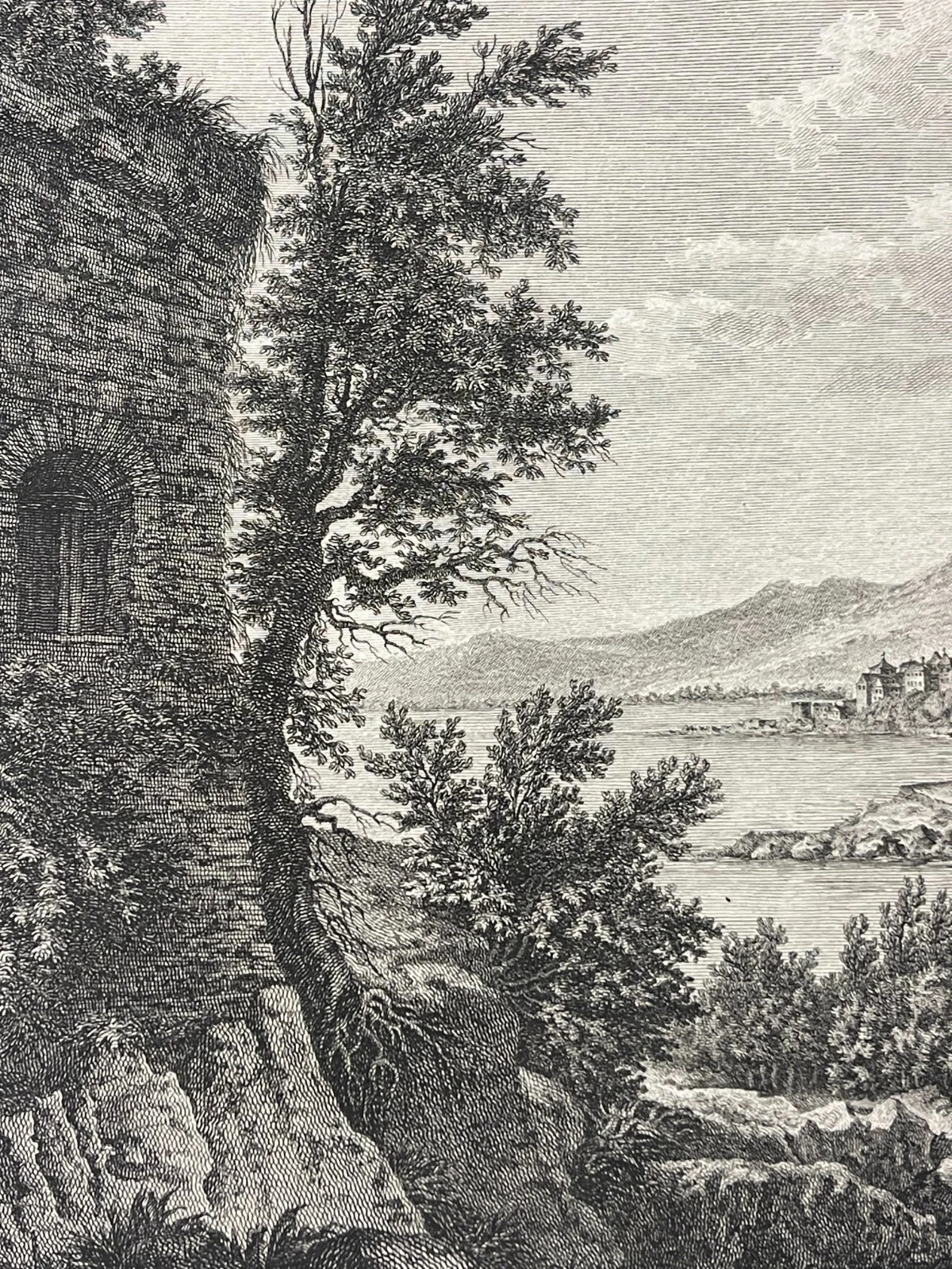 Cette composition élégante et parfaitement construite est réalisée d’après Daubigny, témoigne du goût pour les paysages pittoresques et les vues topographiques à la fin du XVIIIe siècle. La scène déploie une perspective remarquable : au premier plan, un terrain accidenté animé de personnages, puis la baie et la ville de Bastia, dominée par ses édifices et ses fortifications, enfin les reliefs montagneux corses en arrière-plan.