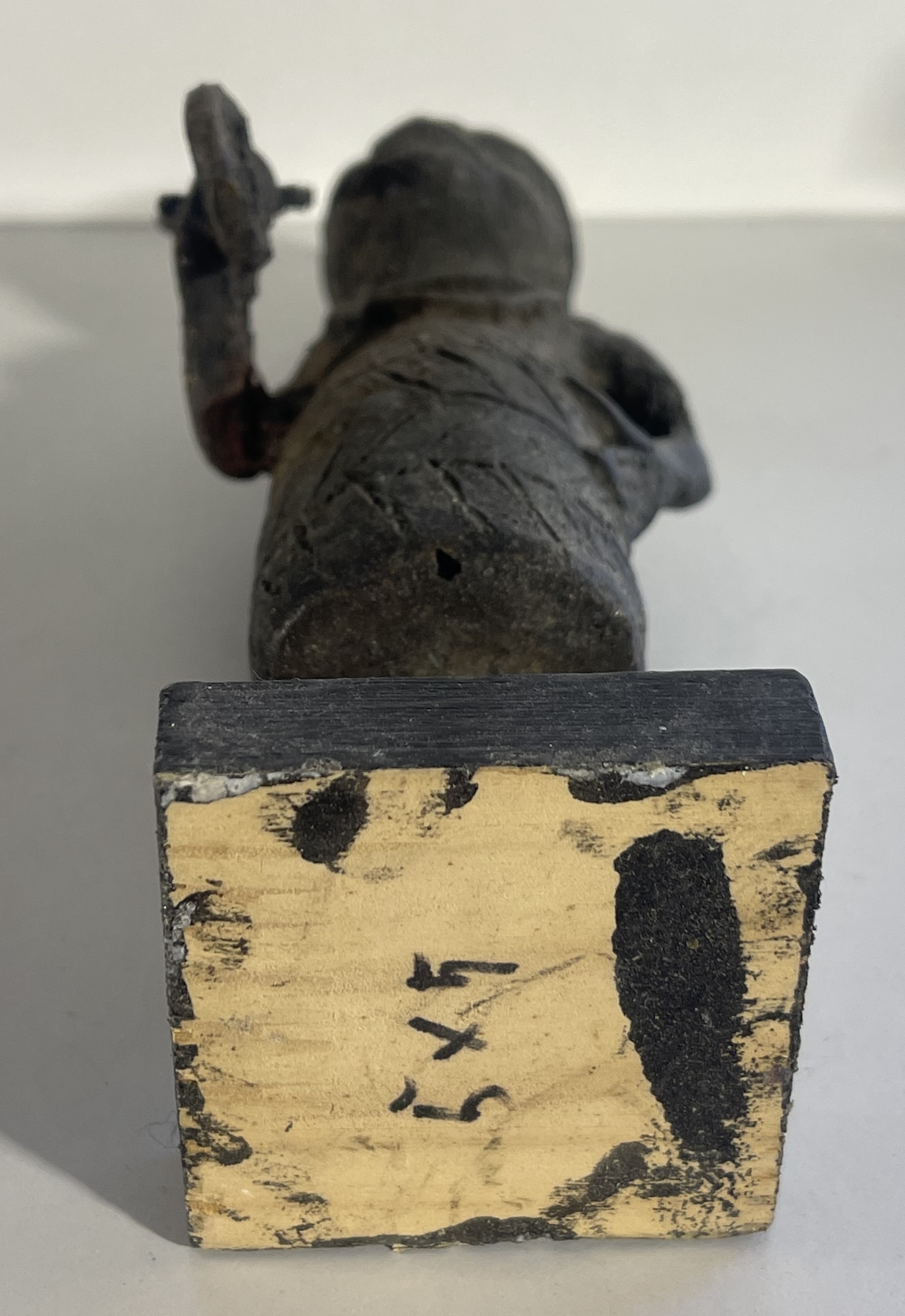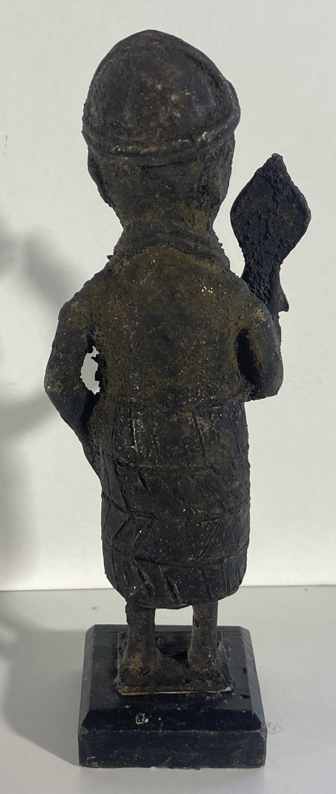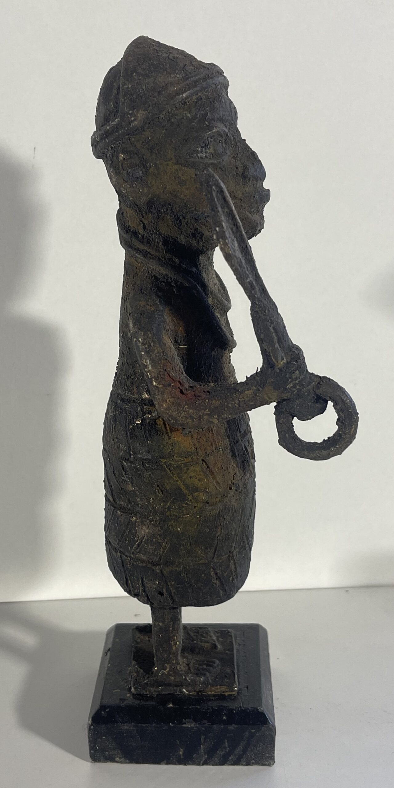 Sculpture réalisée selon la technique traditionnelle de la fonte à la cire perdue. La surface présente une patine sombre avec traces d’oxydation et d’usure, donnant à l’objet un aspect ancien.