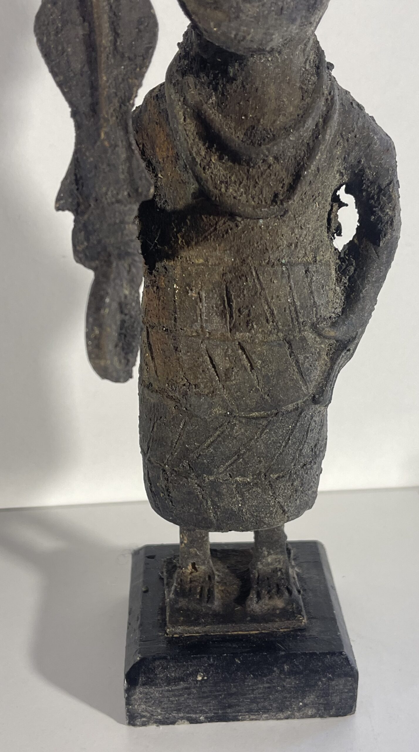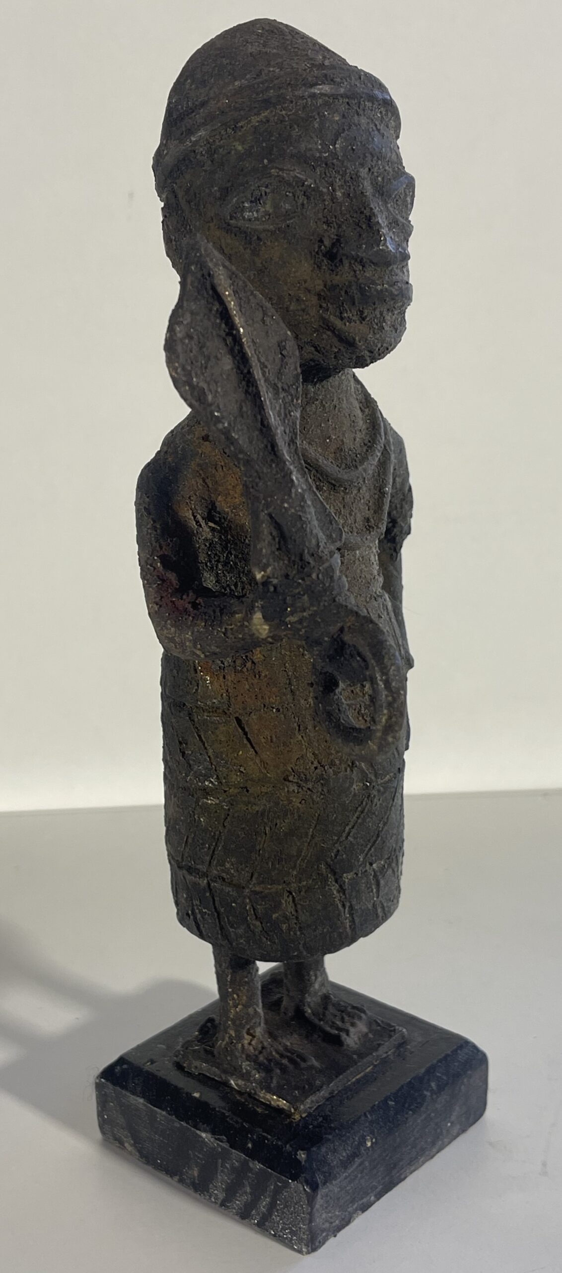 La figure porte une coiffe simple et un vêtement long décoré de motifs incisés. Le visage stylisé aux traits calmes et l’attitude hiératique rappellent les conventions de la statuaire traditionnelle d’Afrique de l’Ouest.