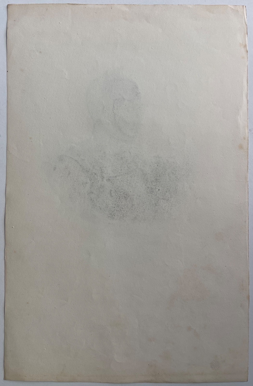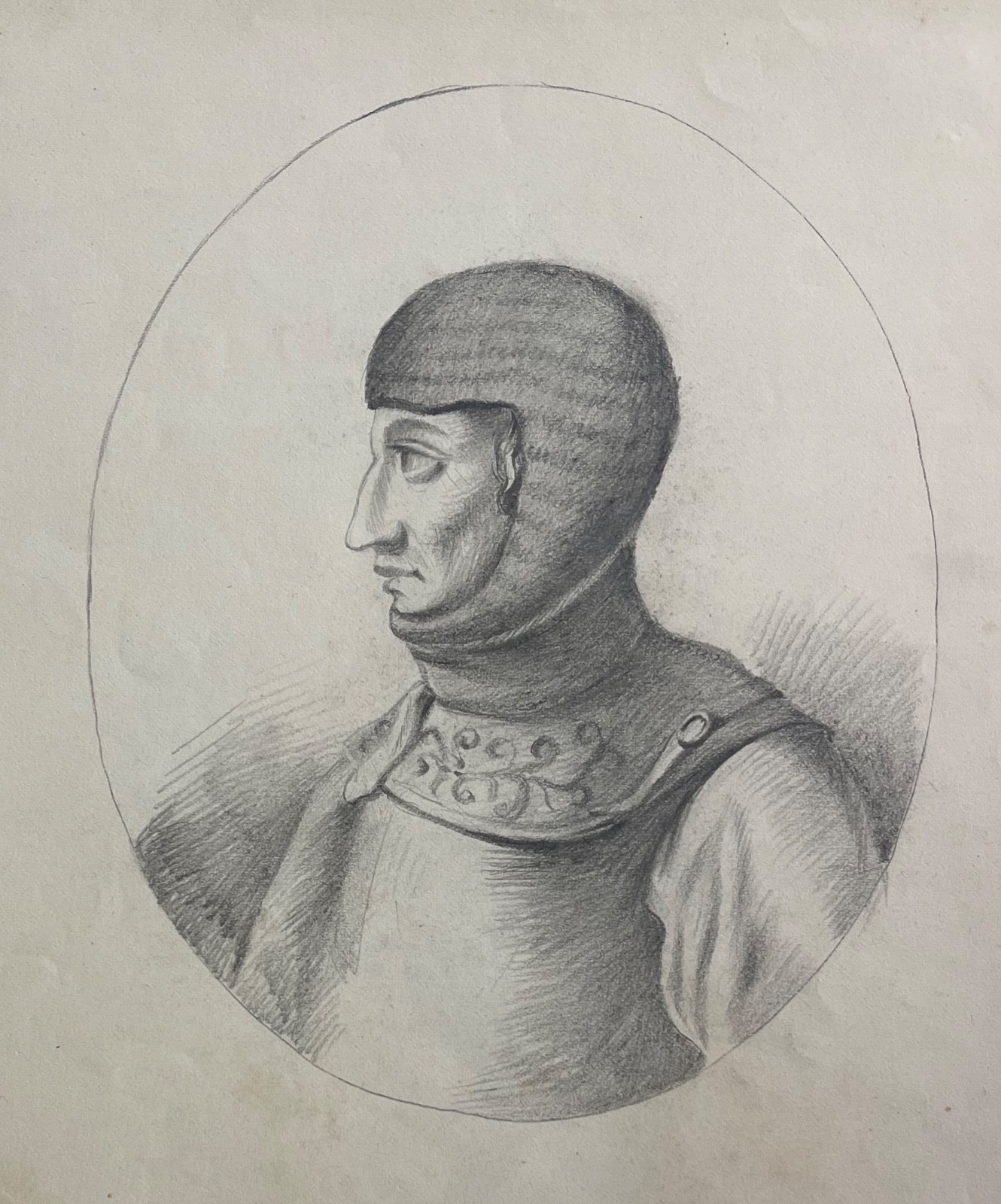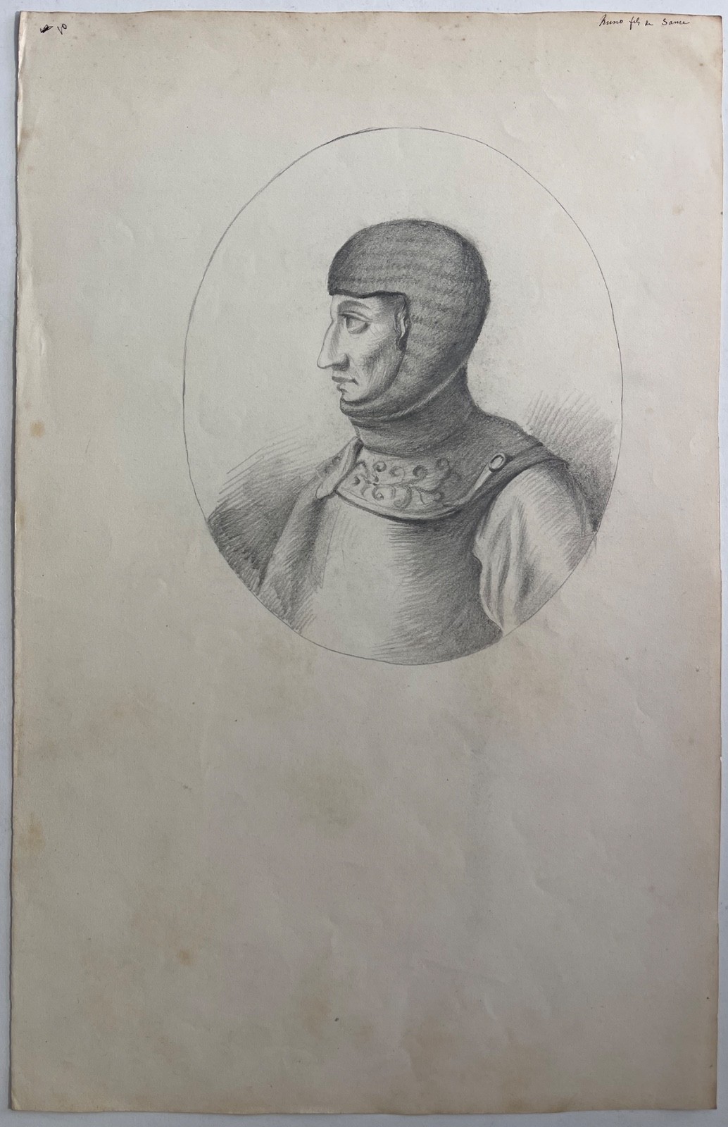 Je vous propose ce dessin ancien représentant Huno fils de Sance (Nuño Sánchez) (1185-1243), personnage de la lignée médiévale liée aux anciens comtes de Provence. Le portrait est exécuté au crayon graphite sur grand papier, dans un médaillon tracé au compas avec un travail fin permettant de modeler les volumes du visage et de l’armure. Cette iconographie appartient à la tradition des portraits historiques publiés dans les chroniques de Provence, notamment dans les ouvrages d’Antoine de Ruffi, dont les illustrations ont servi de référence à de nombreuses représentations ultérieures. Au XIXᵉ siècle, ces figures historiques furent fréquemment redessinées pour illustrer les ouvrages consacrés à l’histoire médiévale de la Provence et aux dynasties qui s’y succédèrent. Le personnage est représenté de profil, coiffé d’un camail et vêtu d’une armure, selon l’iconographie traditionnelle des princes et chevaliers médiévaux. Dimensions : 34,2 × 22 cm. Ce dessin appartient à une série de portraits historiques liés aux comtes et princes de Provence, inspirée des iconographies publiées dans les chroniques anciennes de Ruffi. Ce type de dessin étaient fournis aux graveurs qui réalisaient ensuite la gravure sur bois destinée à l’impression de gravures historiques. Il en porte les marques. C’est donc le dessin qui a permis l’édition de la gravure vers 1850.