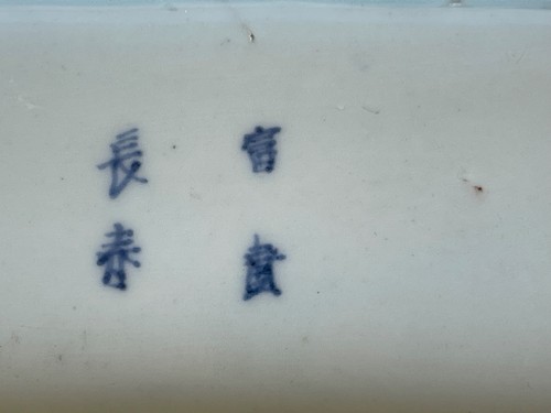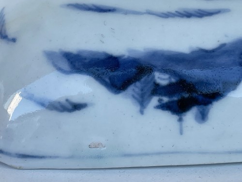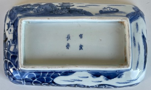 Je vous propose cette coupelle rectangulaire en porcelaine sometsuke (bleu sous couverte), Japon, Arita, période Edo (fin XVIIe voir début XVIIIe siècle), de forme rectangulaire aux angles adoucis reposant sur un large talon creusé. Décor intérieur en camaïeu de bleu cobalt représentant un paysage d’inspiration chinoise composé de pavillons, pont arqué, pagode et montagnes stylisées sous des nuées flottantes. Le premier plan étant occupé par un vaste motif spiralé évoquant des vagues stylisées ou rinceaux marins traités en larges réserves graphiques. Pâte fine légèrement ivoirine sous glaçure transparente brillante, avec usure périphérique cohérente avec l’âge. Au revers, marque en bleu sous couverte à quatre caractères disposés en carré, correspondant à l’inscription de bon augure « Fugui Changchun » (富貴長春), signifiant « Richesse, noblesse et printemps éternels », formule fréquemment utilisée sur les porcelaines chinoises des périodes Jiajing, Wanli et Chongzhen et reprise au Japon dans les productions d’Arita d’inspiration Ming. Ensemble caractéristique des Ko-Imari anciennes influencées par les modèles chinois transitionnels et destinées tant au marché intérieur japonais qu’à l’exportation au tournant des XVIIe et XVIIIe siècles.