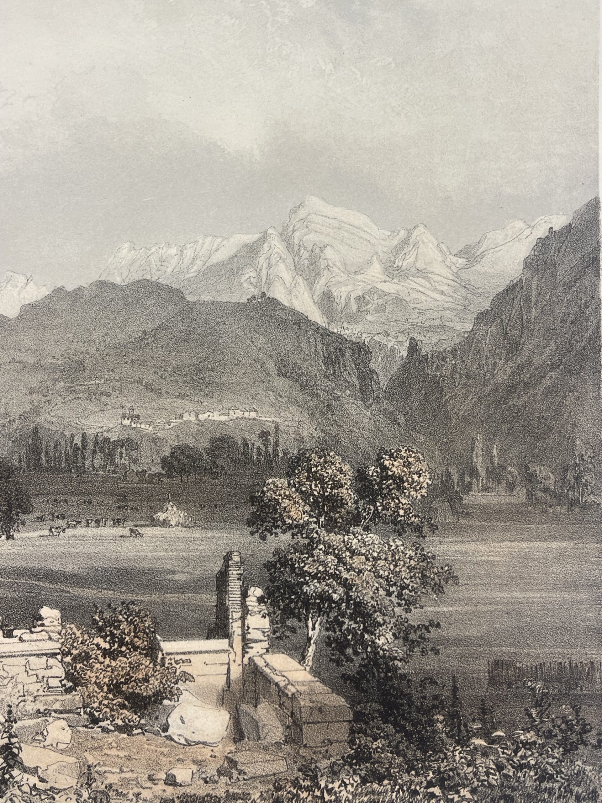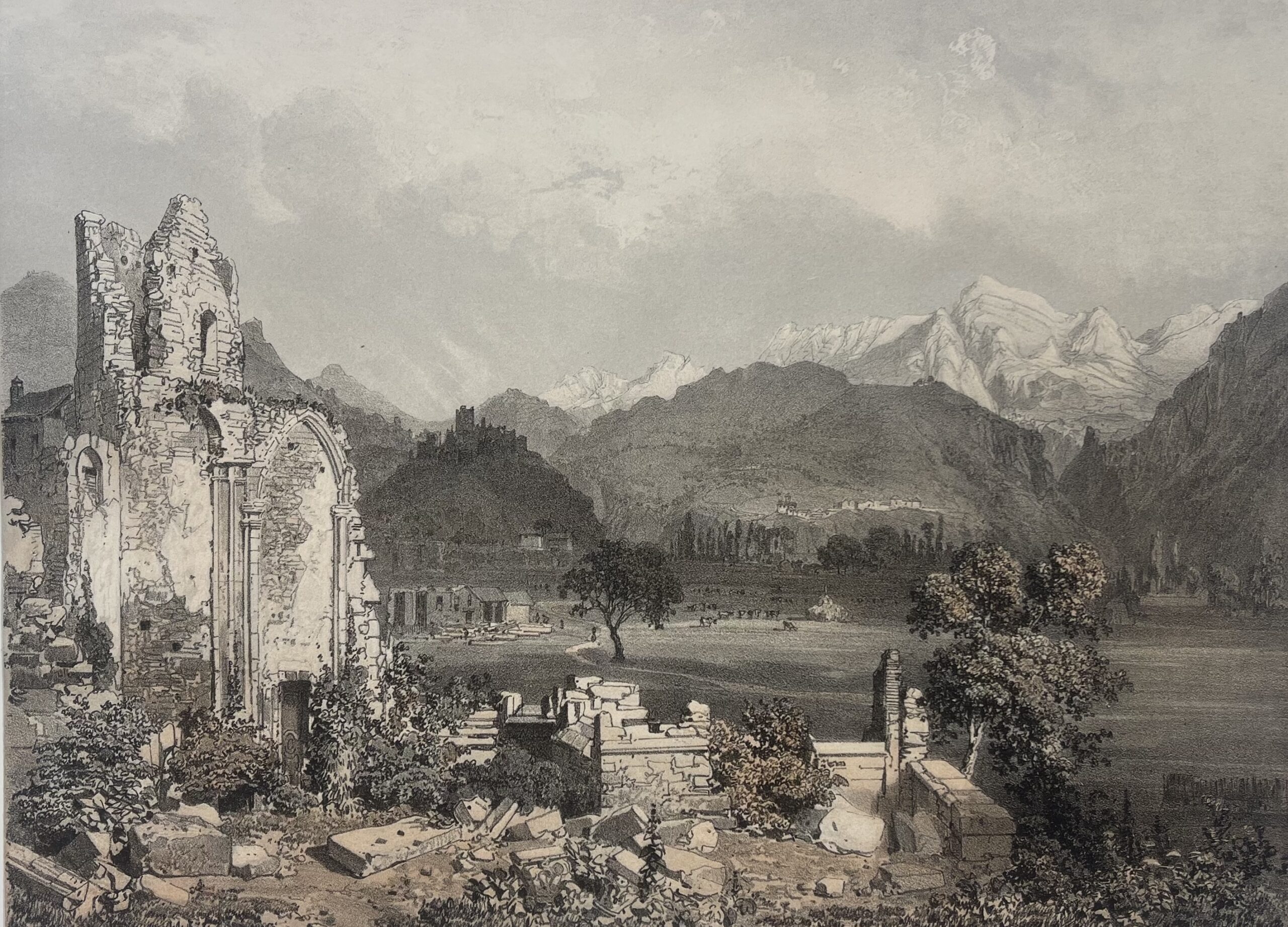 La scène offre une vue pittoresque de la vallée avec ruines au premier plan, architecture locale et panorama alpin en arrière-plan, illustrant parfaitement l’esthétique romantique du XIXe siècle et l’intérêt pour les paysages historiques et naturels.