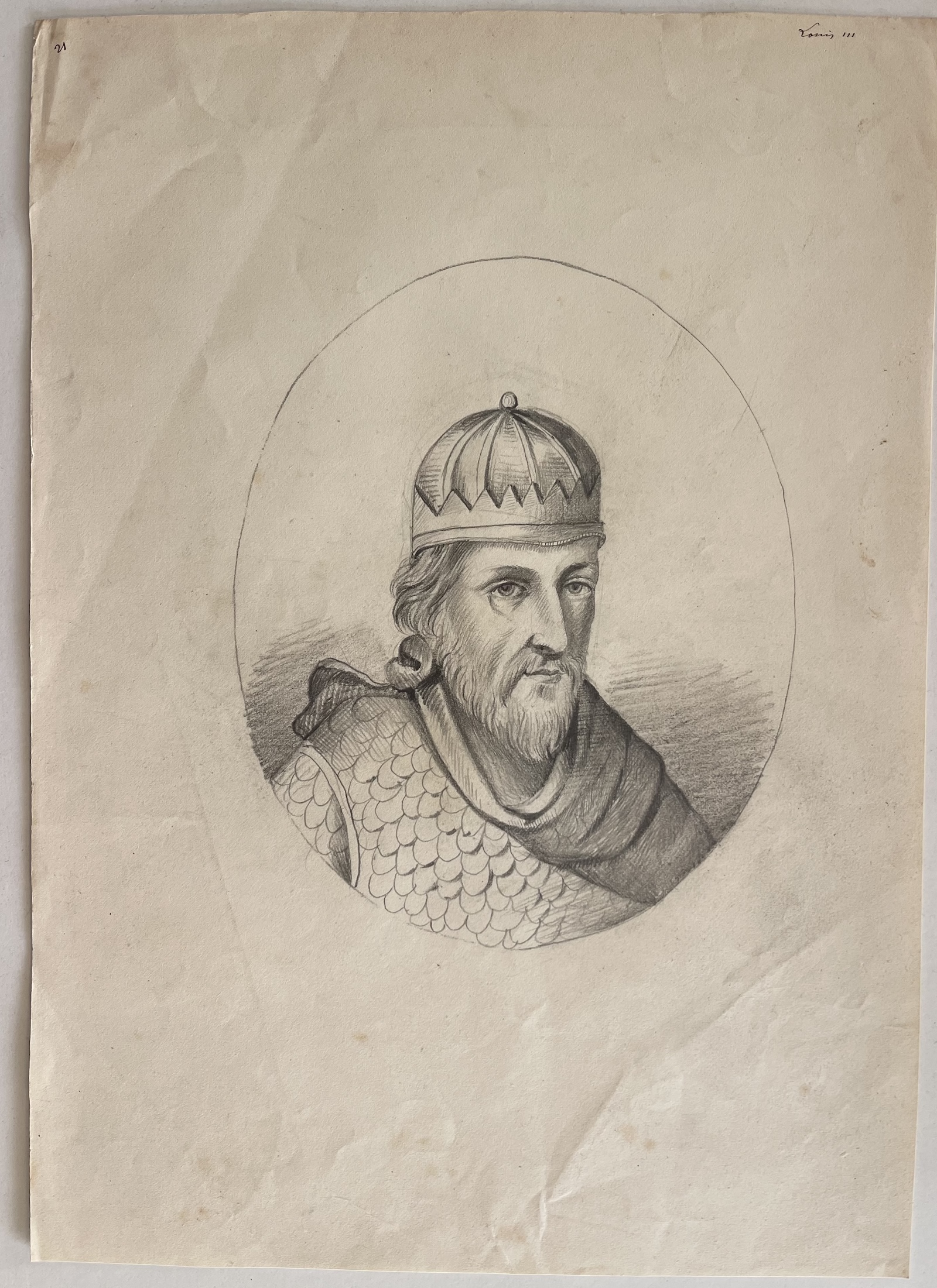 Très intéressant dessin ancien représentant Louis III d’Anjou (1403-1434), prince de la maison d’Anjou, roi titulaire de Naples, de Sicile et de Jérusalem. Le portrait est exécuté au crayon graphite sur grand papier, dans un médaillon tracé au compas, avec un travail fin permettant de modeler le visage et les vêtements.