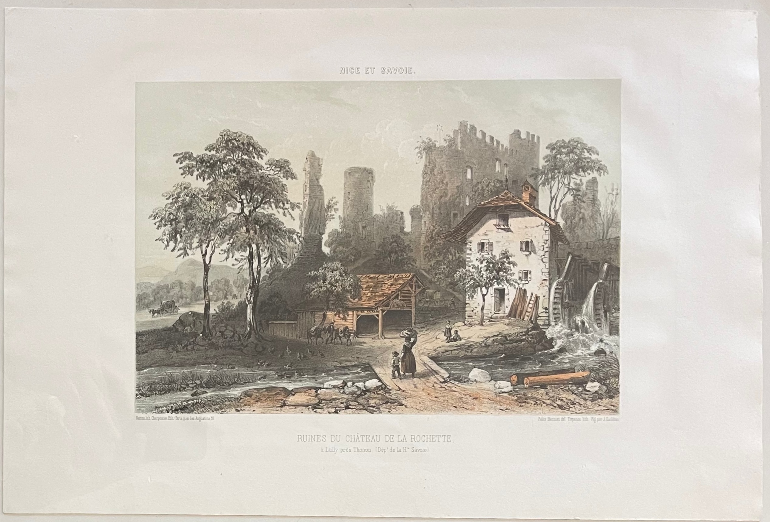 Antique 19th century lithograph depicting the ruins of Château de la Rochette in Lully near Thonon, French Alps (Haute-Savoie).From the Nice et Savoie series by Félix Benoist, circa 1860. Sheet: 47.5 × 32 cm – Image: 30.5 × 21 cm