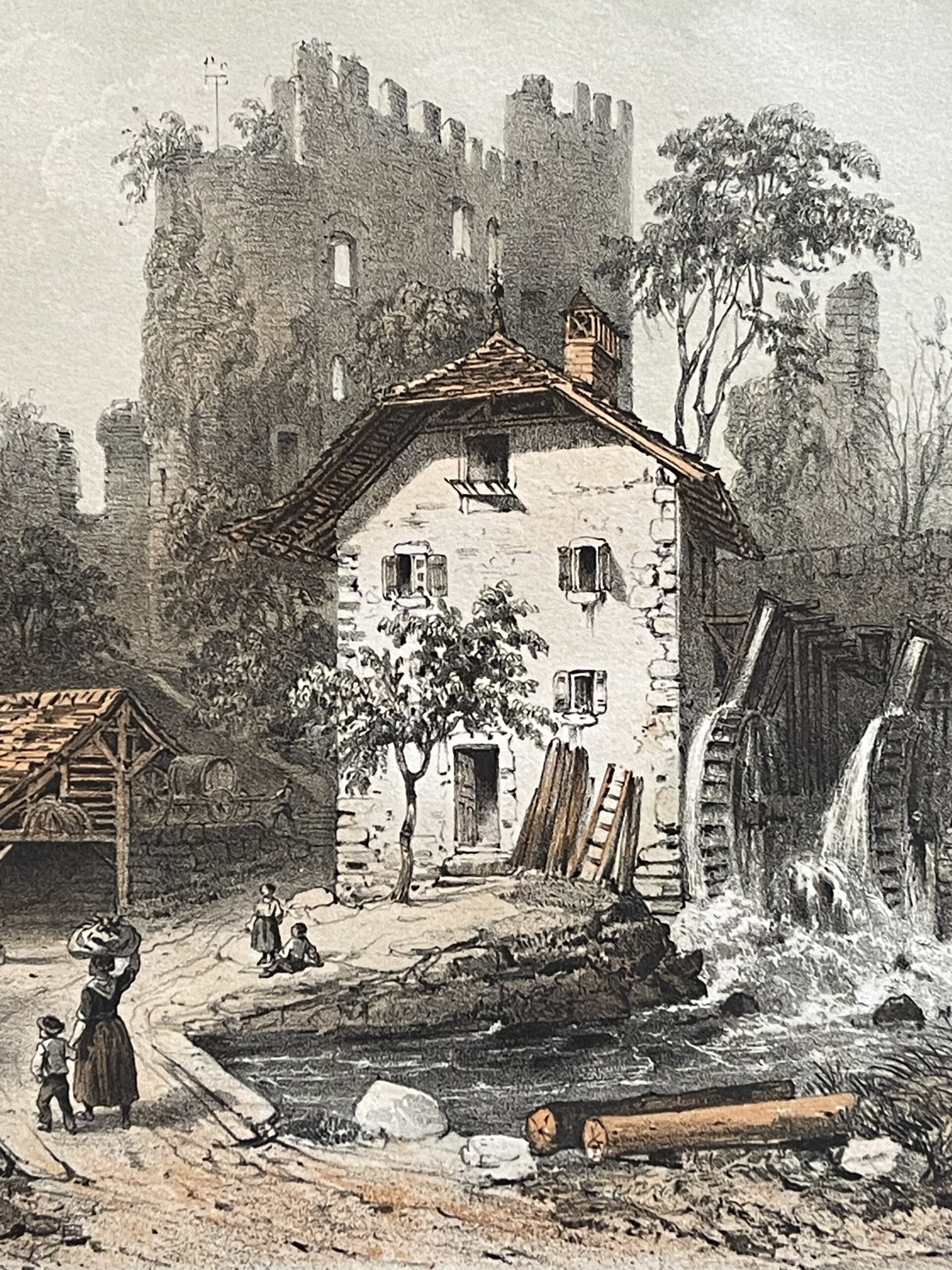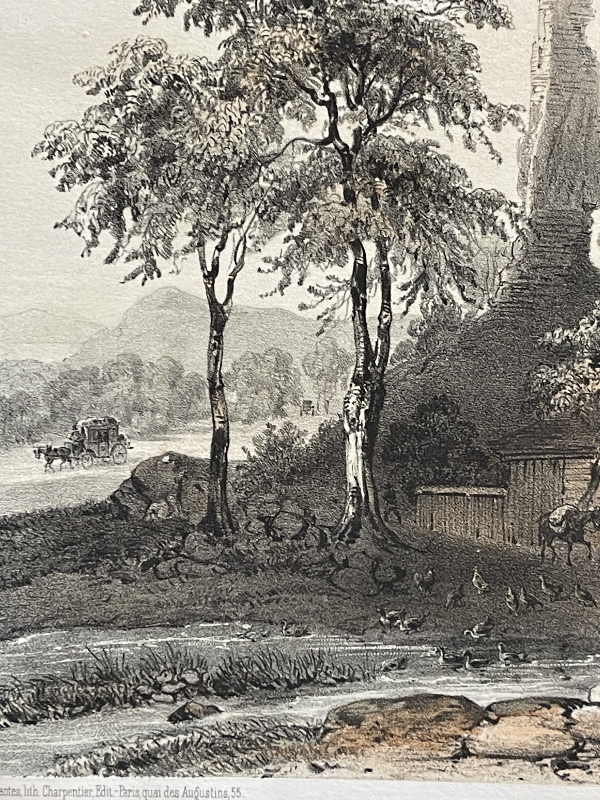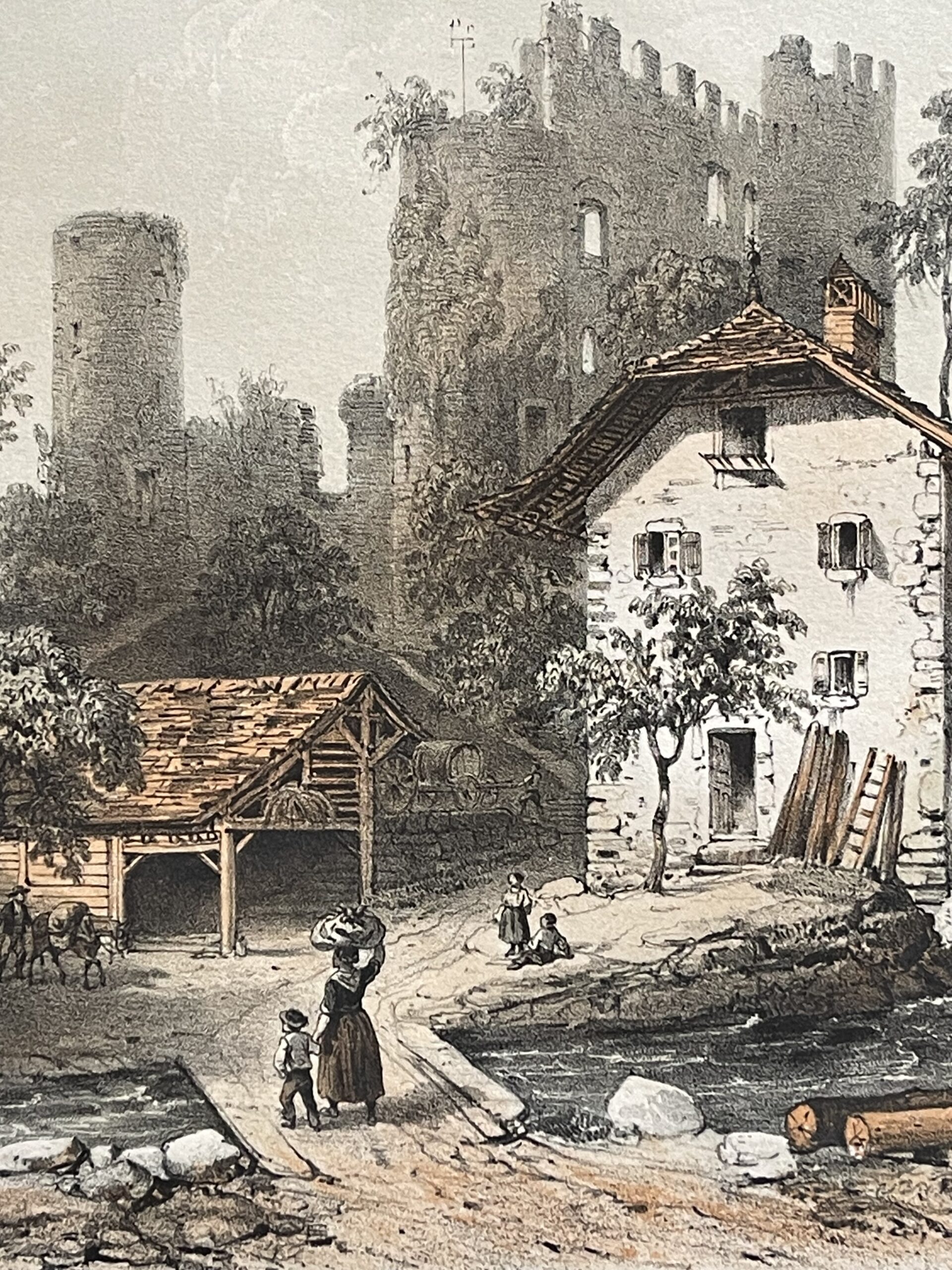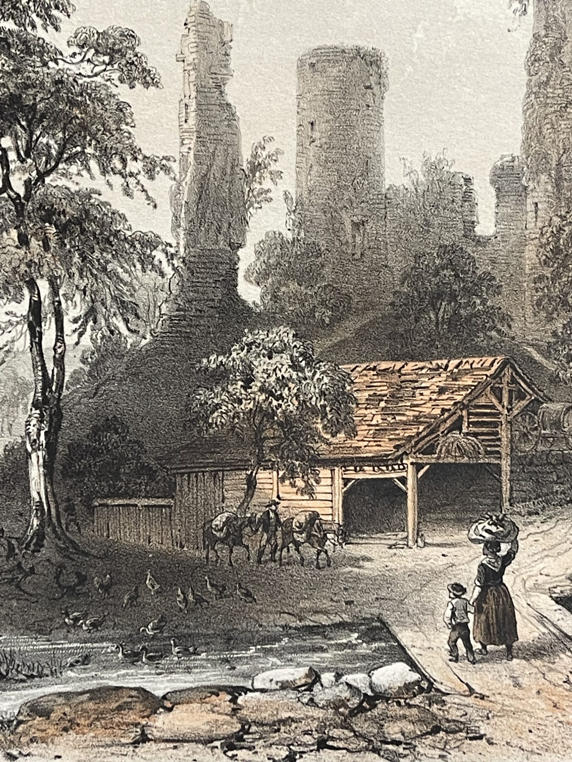 La composition mêle la pittoresque vie rurale aux ruines romantiques, caractéristique du goût du XIXe siècle pour les paysages historiques, conférant à cette estampe une valeur à la fois décorative et chargée d’histoire.