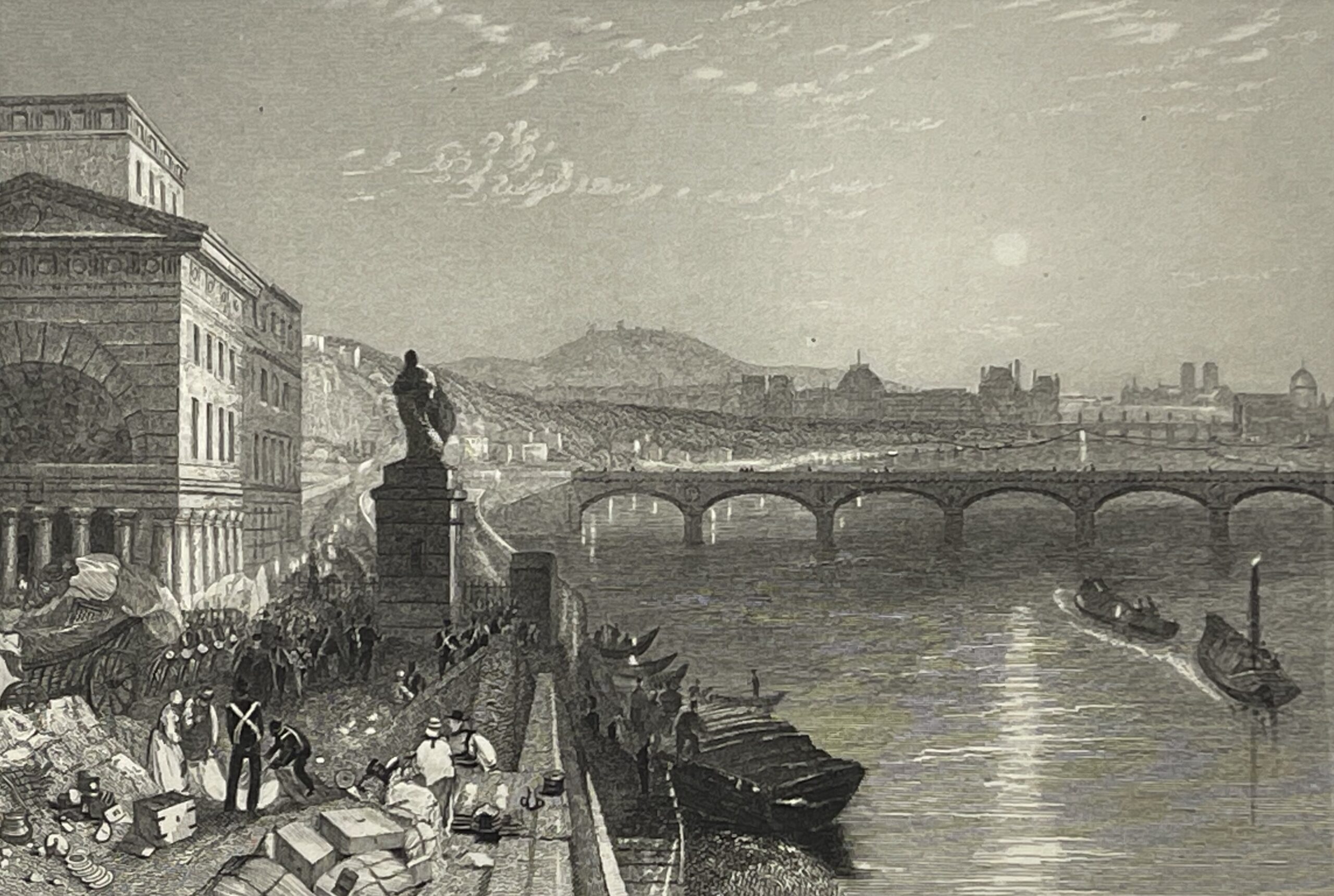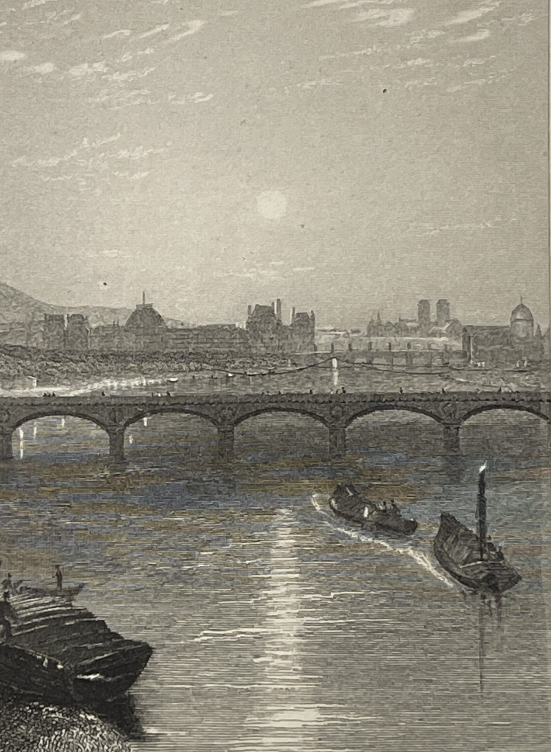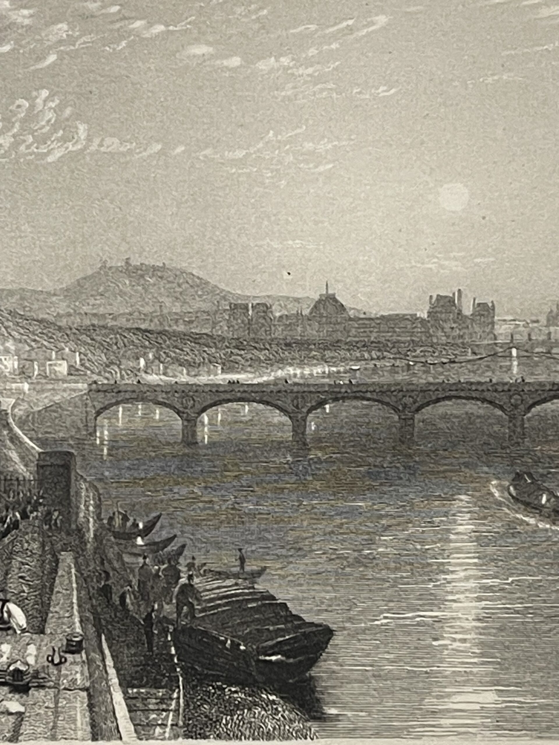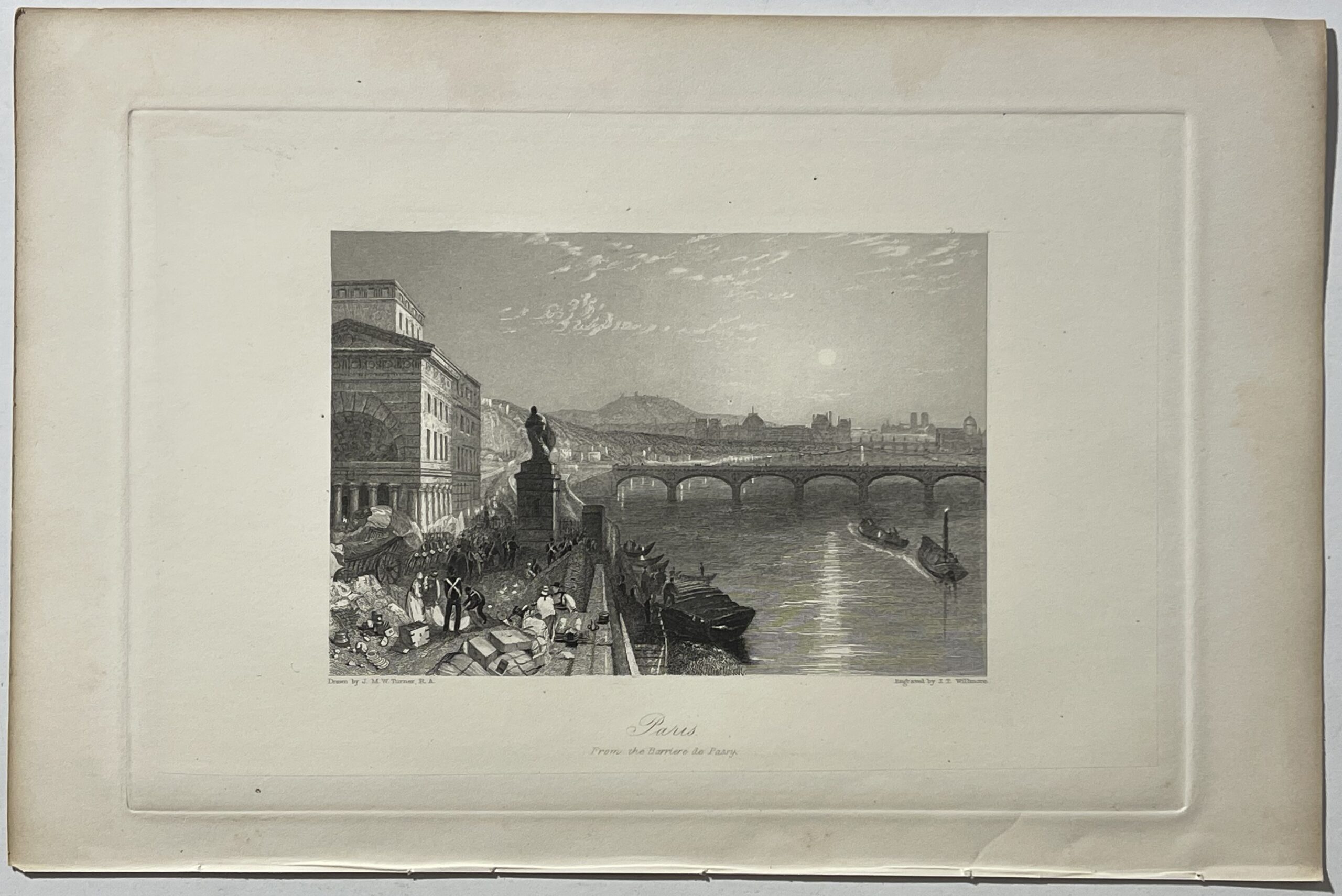 Turner restitue ici une vision vivante et atmosphérique de Paris, caractéristique de son approche romantique, où lumière, eau et architecture dialoguent avec subtilité. La gravure, exécutée par Willmore, traduit avec finesse cette sensibilité à travers un travail précis du trait et des contrastes.