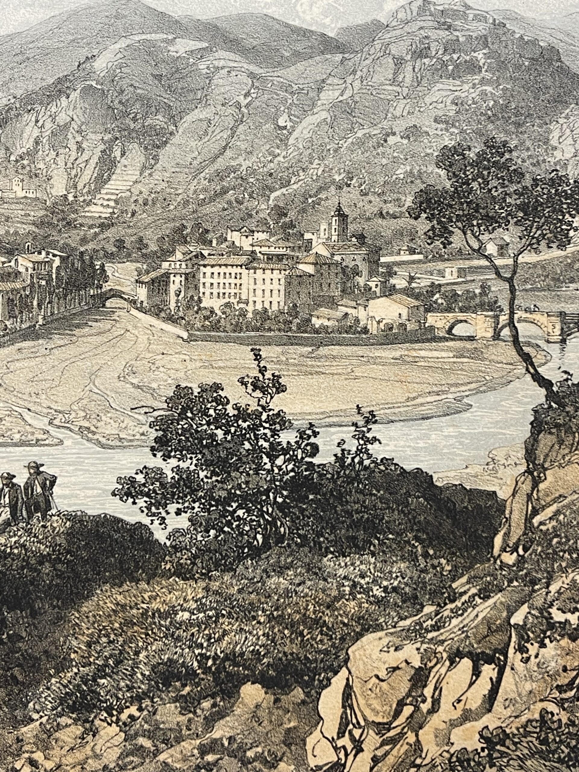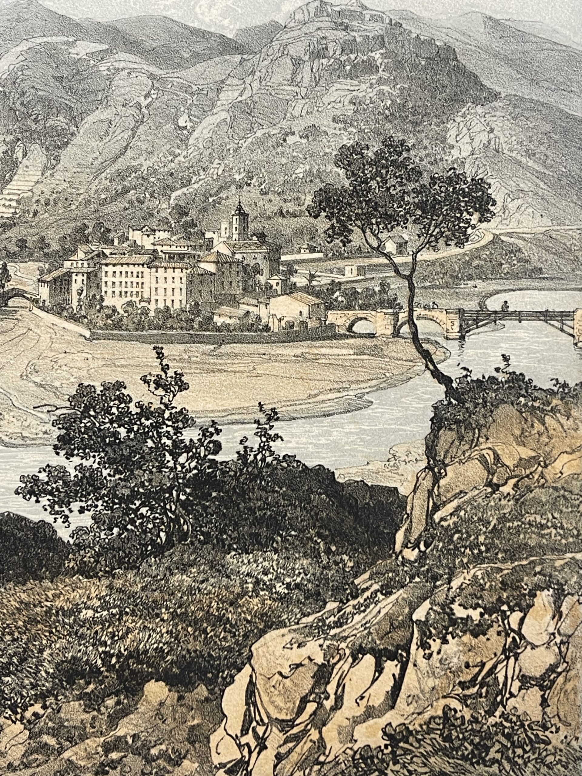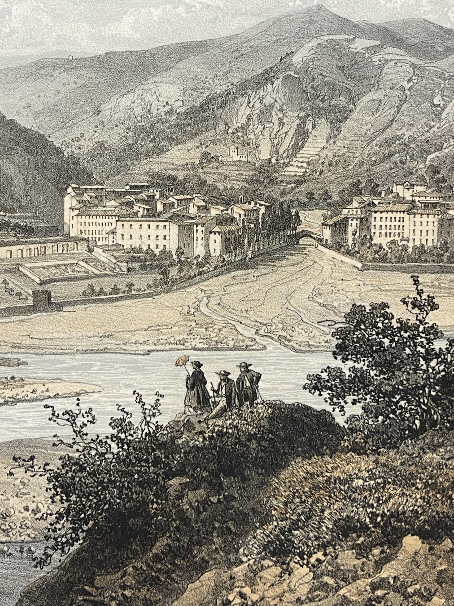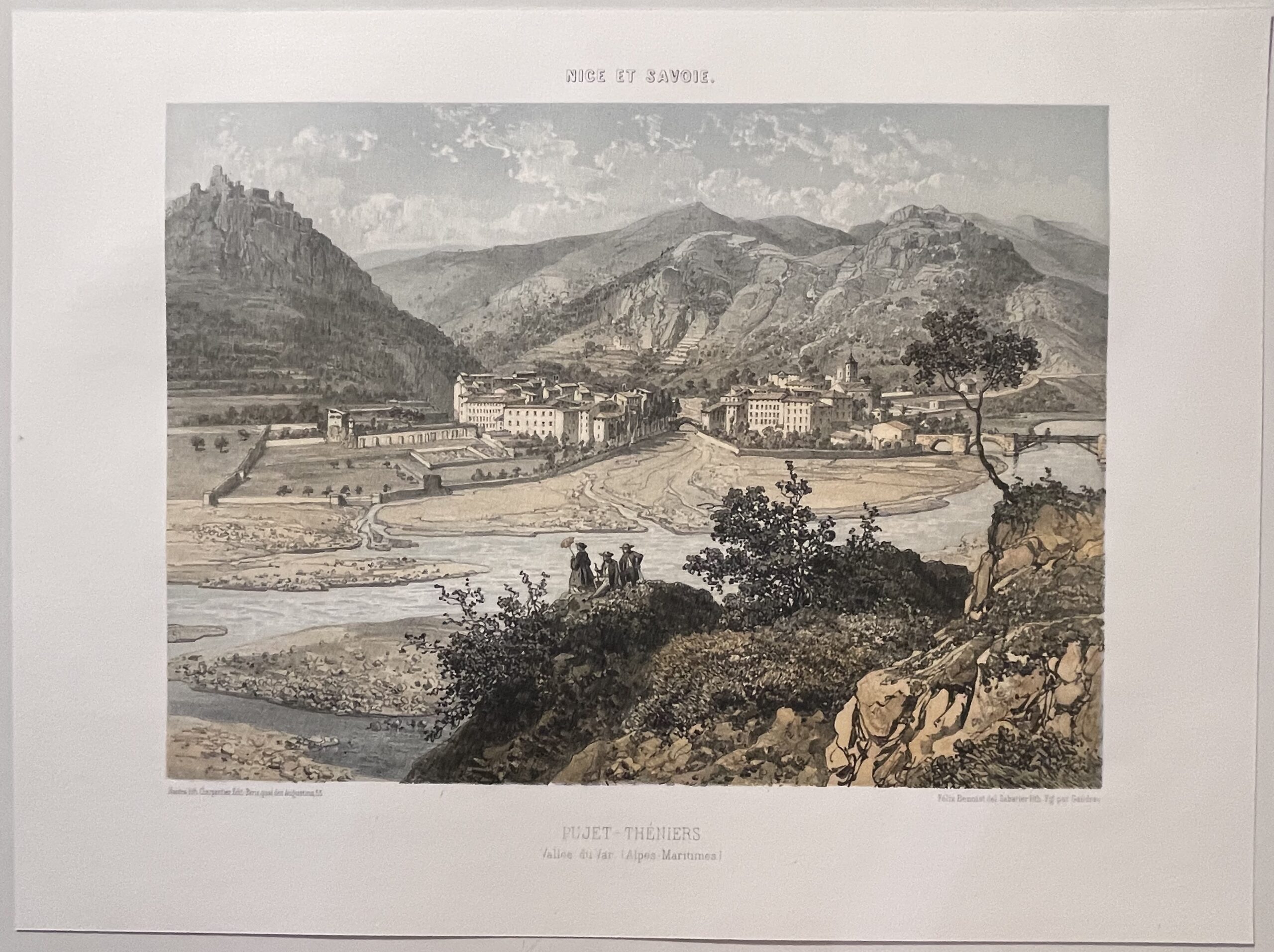 Je vous propose cette belle lithographie de 1864 représentant Puget-Théniers, dans la vallée du Var (Alpes-Maritimes). La scène offre une vue panoramique très lisible du bourg, organisé autour de la rivière Var qui structure toute la composition. Le premier plan, animé par des personnages, ouvre la perspective vers le village et ses bâtiments, tandis que les reliefs montagneux ferment l’horizon avec élégance.