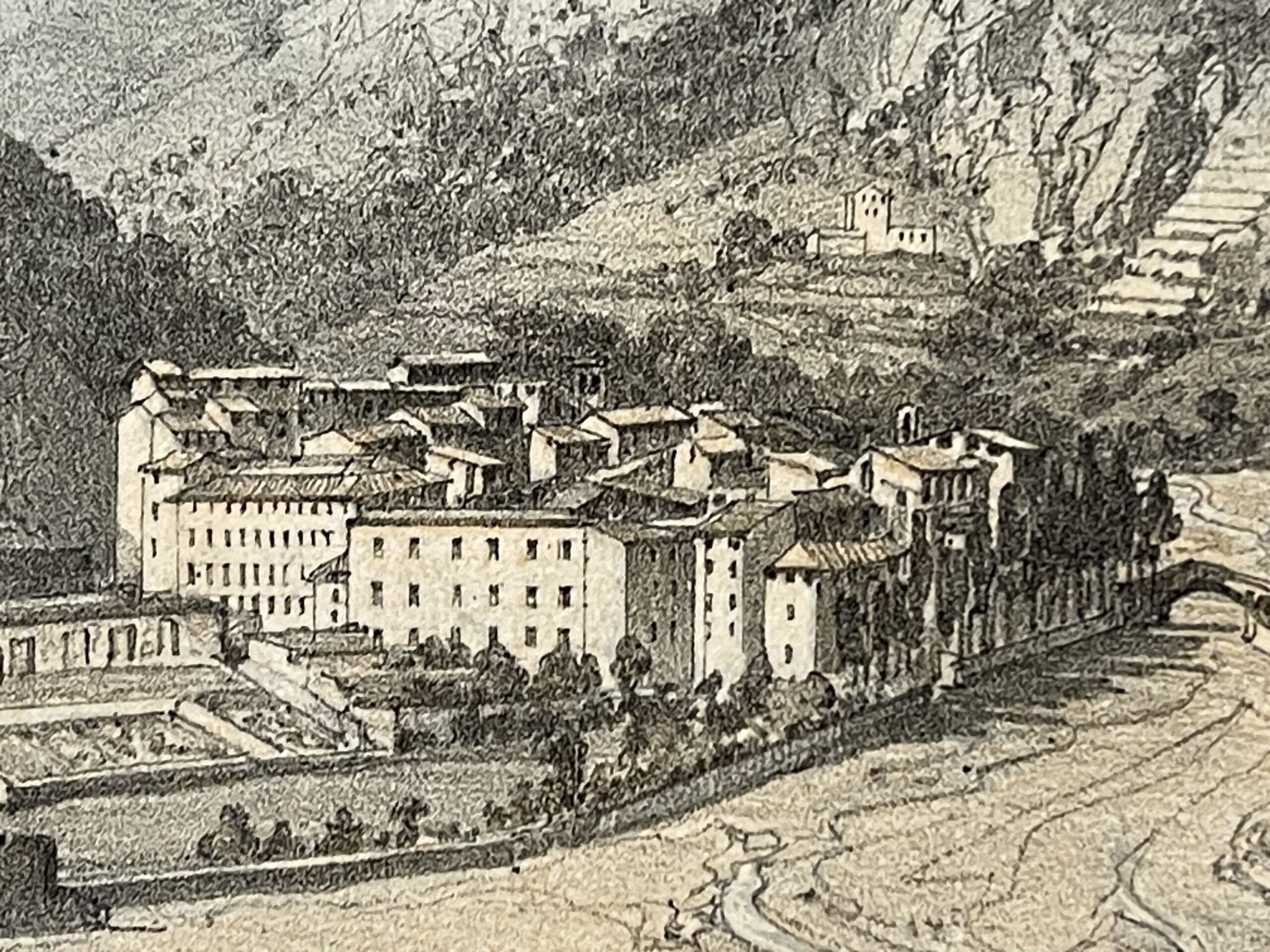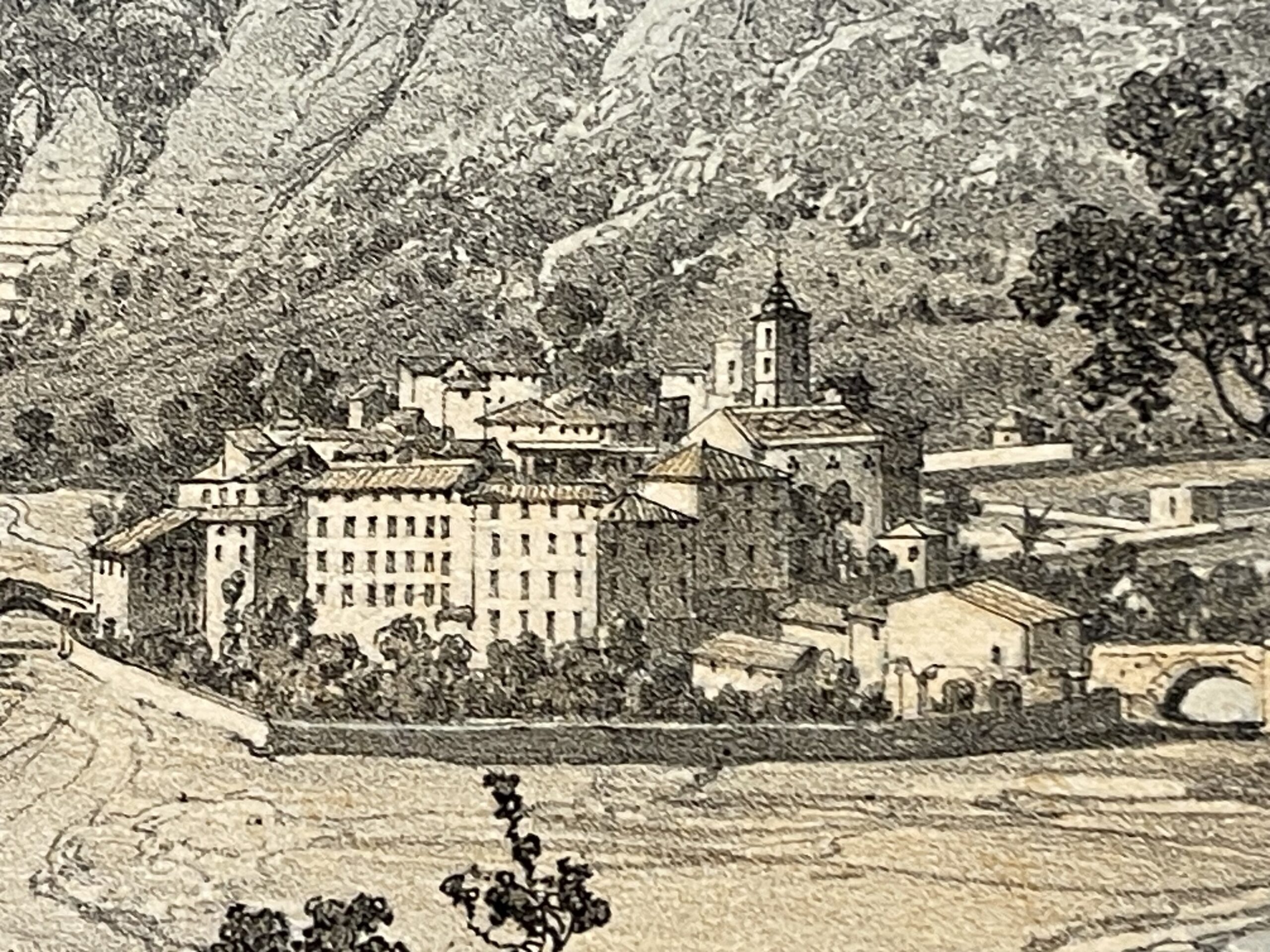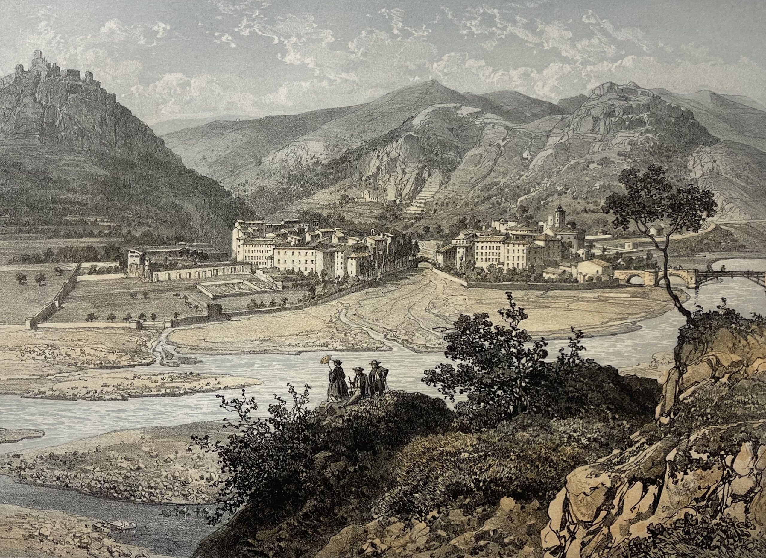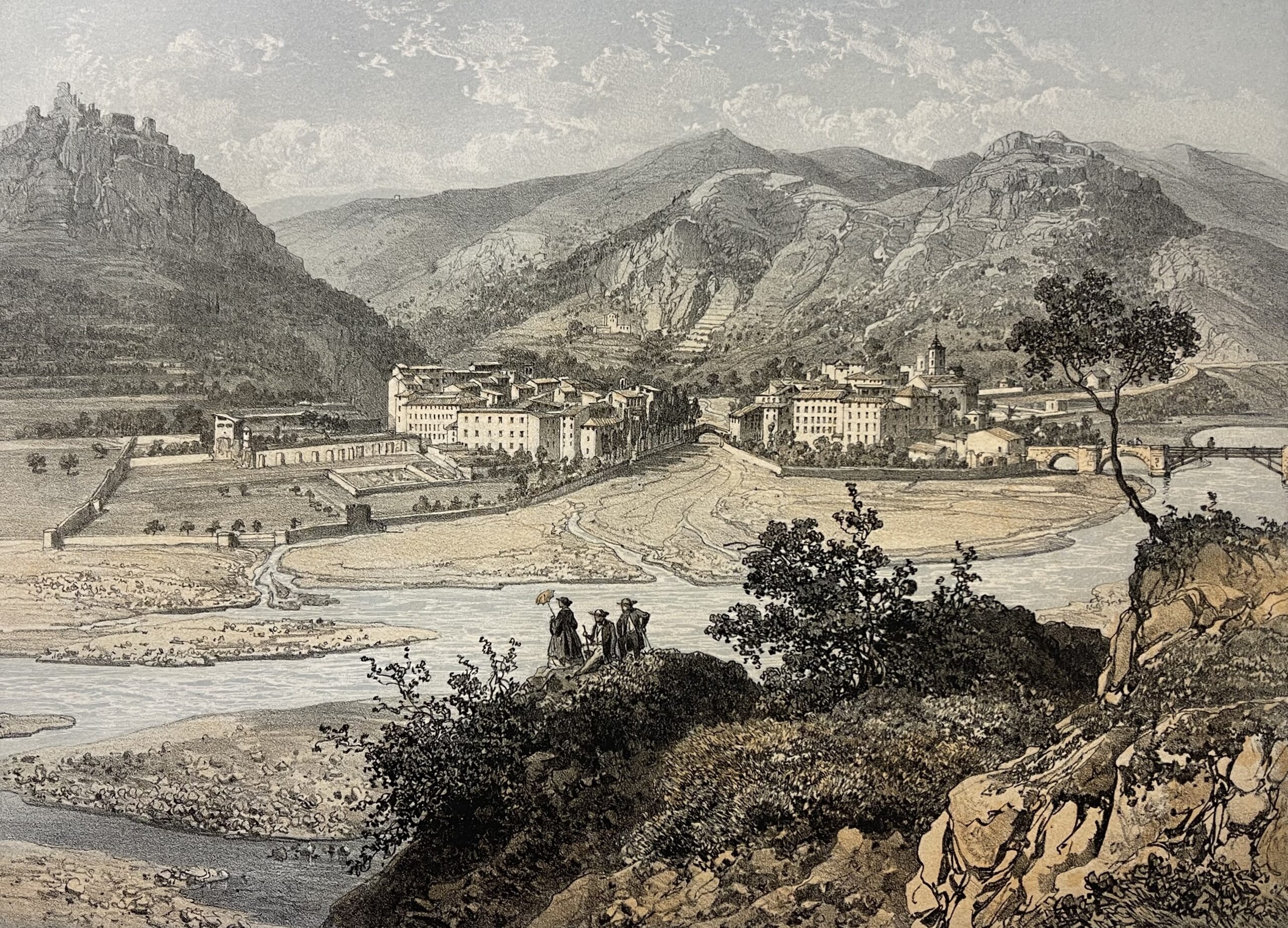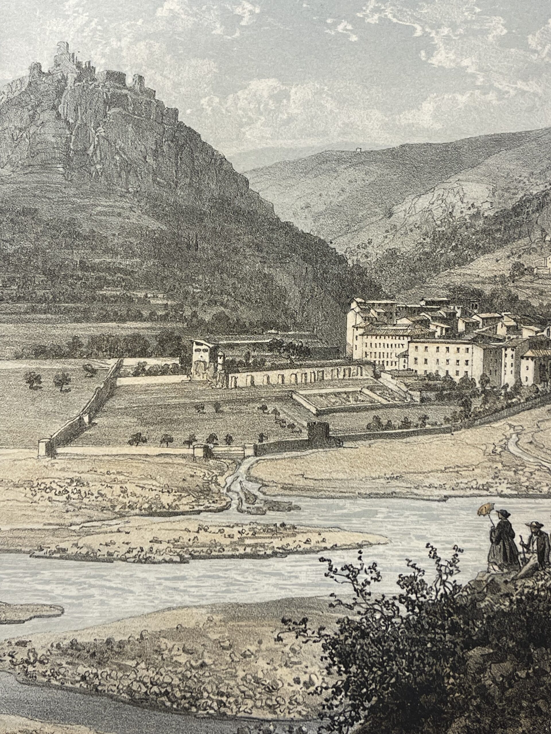 Je vous propose cette belle lithographie de 1864 représentant Puget-Théniers, dans la vallée du Var (Alpes-Maritimes). La scène offre une vue panoramique très lisible du bourg, organisé autour de la rivière Var qui structure toute la composition. Le premier plan, animé par des personnages, ouvre la perspective vers le village et ses bâtiments, tandis que les reliefs montagneux ferment l’horizon avec élégance.