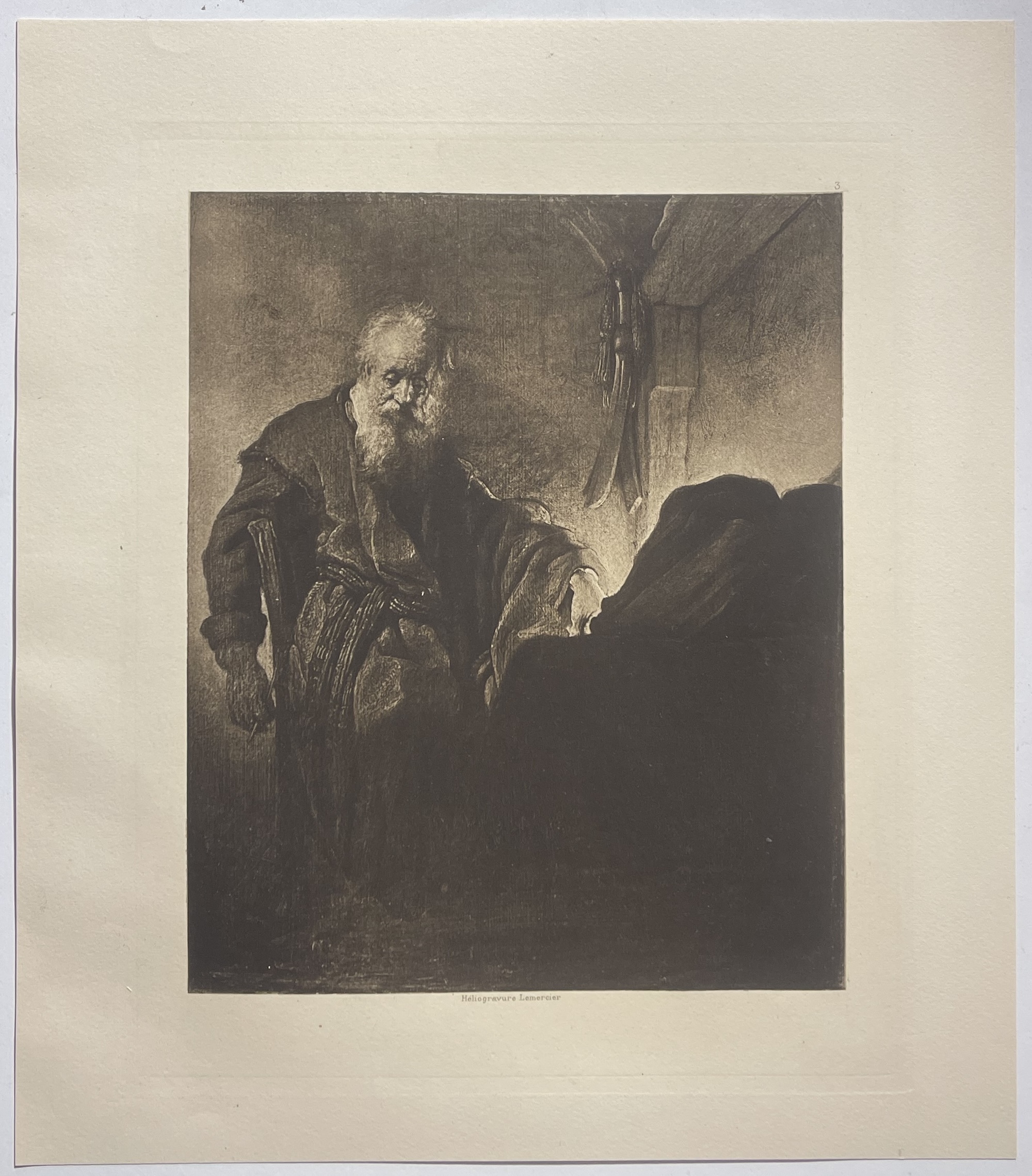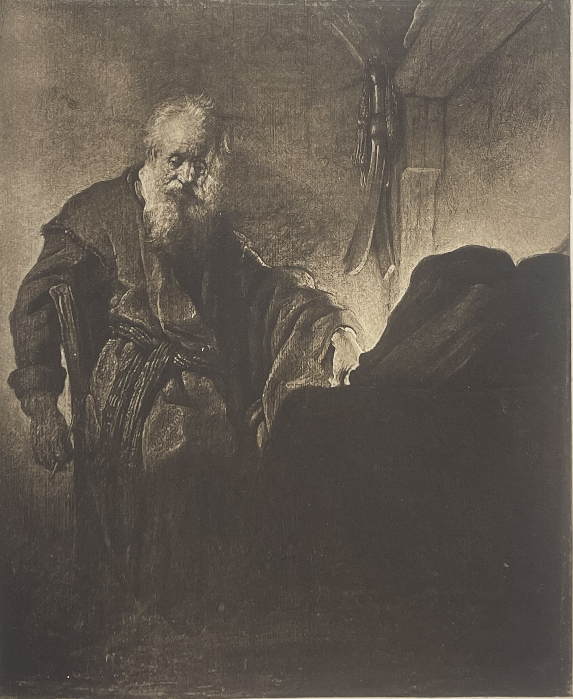 Héliogravure ancienne (1898) d’après Rembrandt, Saint Paul à sa table de travail. Clair-obscur puissant. Format papier 33,2 × 29,3 cm ; image 23,3 × 19,3 cm.