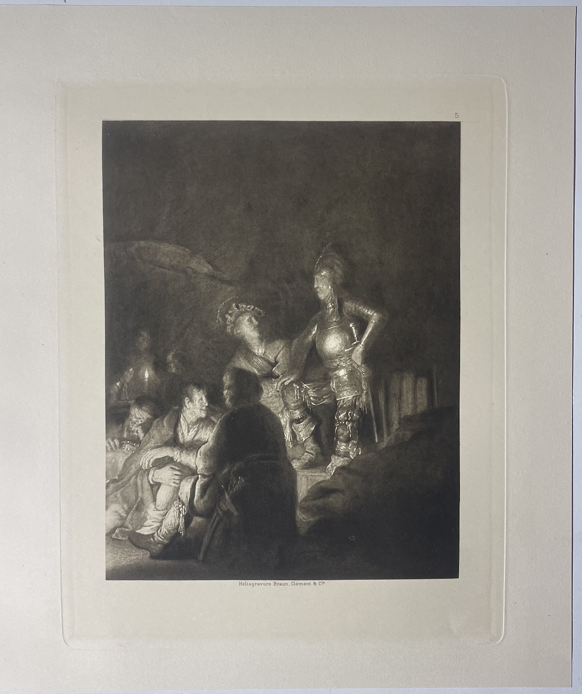 Héliogravure ancienne de 1898 d’après Rembrandt van Rijn (1606-1669), représentant Saint Pierre au milieu des valets du grand prêtre, scène issue des épisodes de la Passion du Christ.