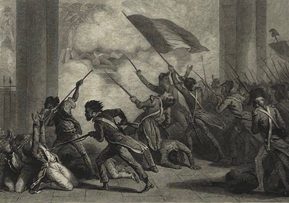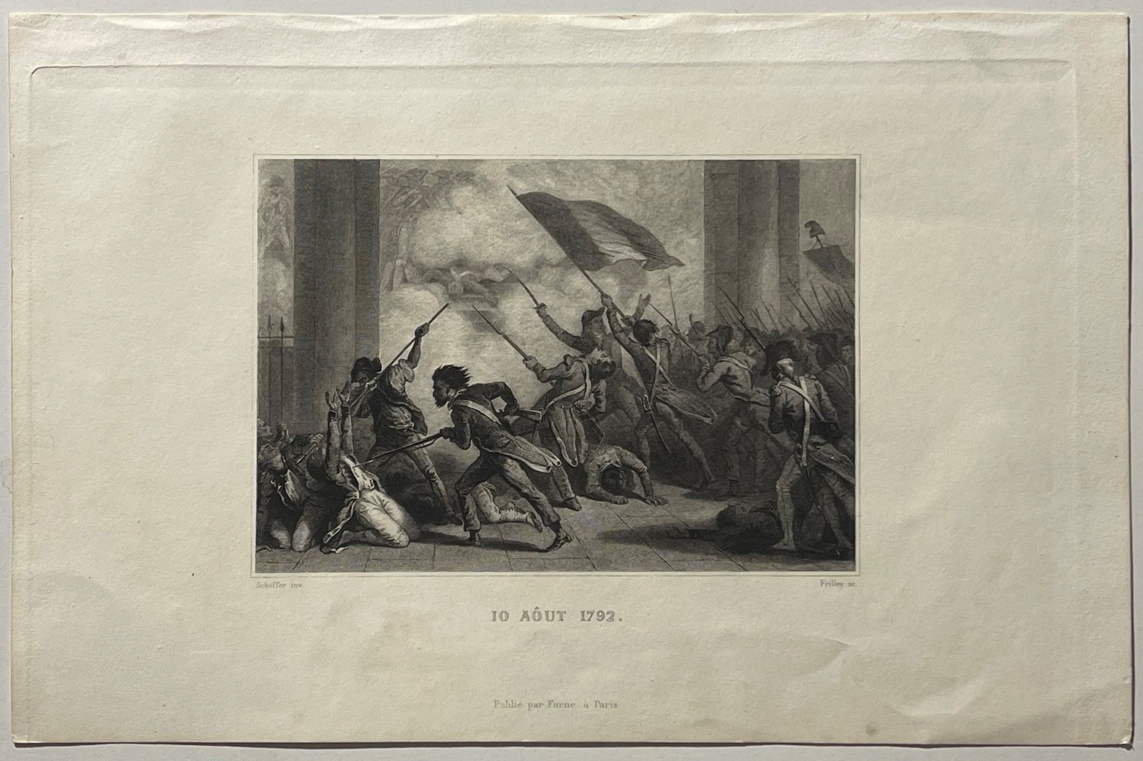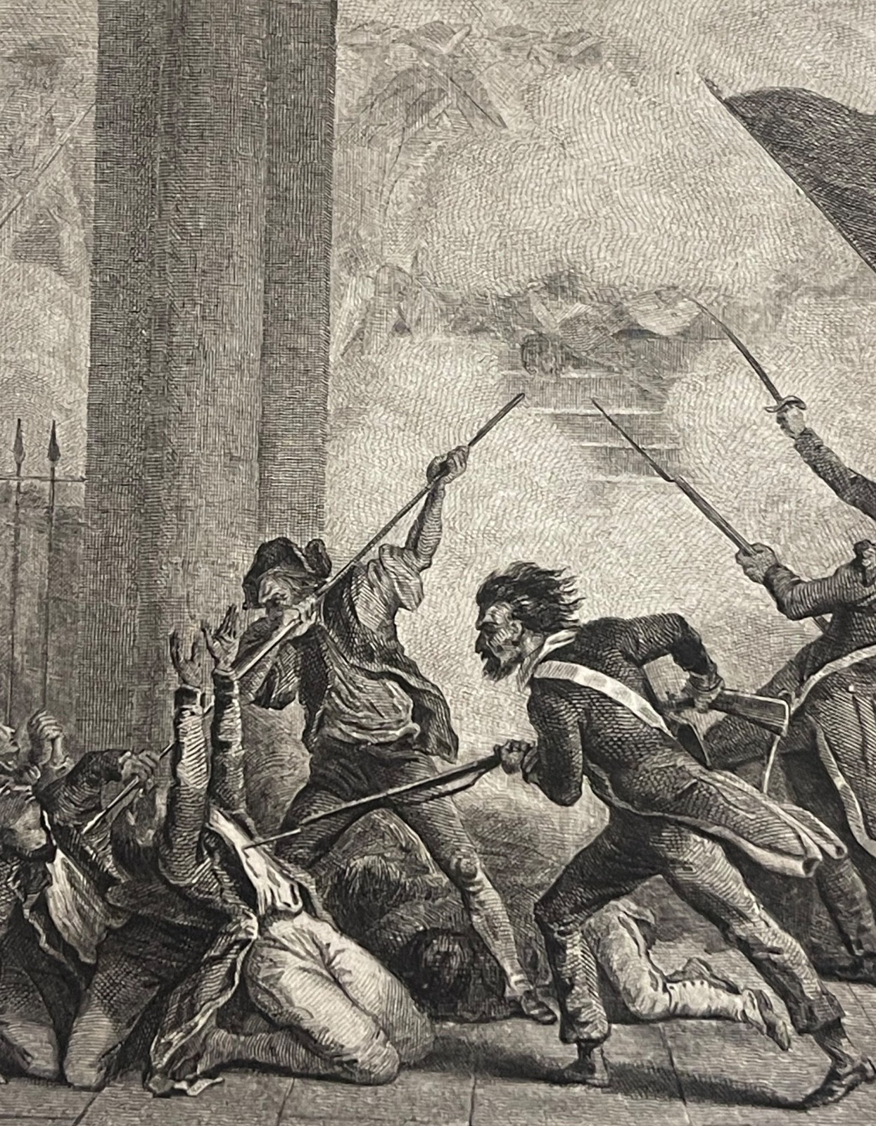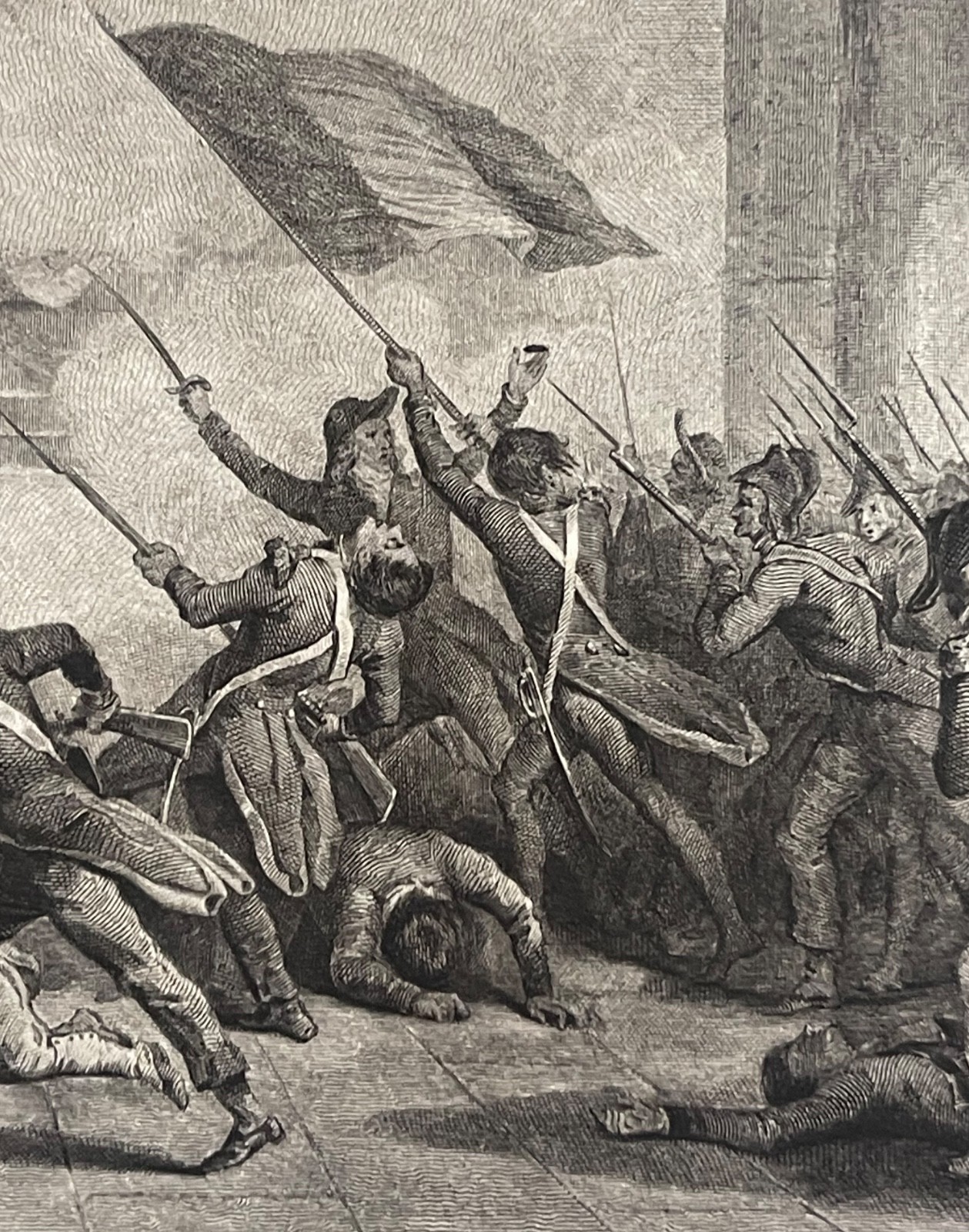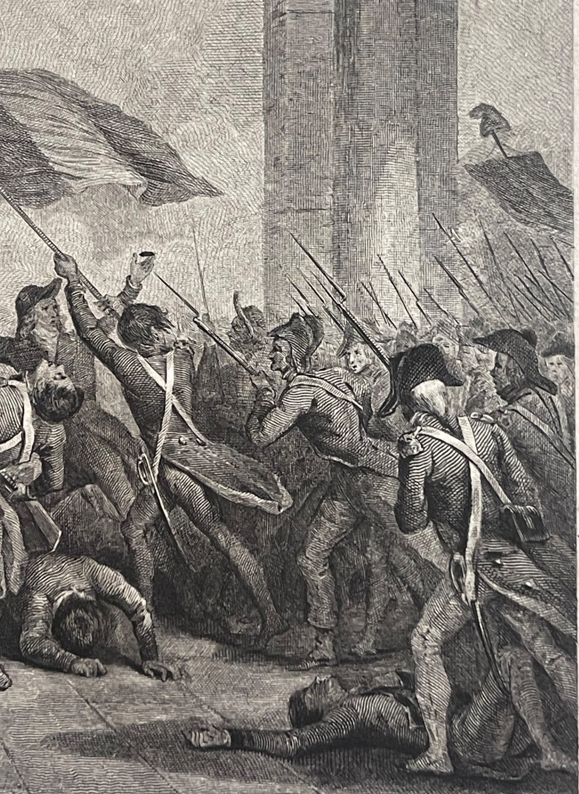 Je vous propose cette gravure historique intitulée « 10 AOÛT 1792 », représentant l’un des épisodes les plus violents de la Révolution française : l’assaut du palais des Tuileries et la chute de la monarchie de Louis XVI. La scène montre l’affrontement brutal entre insurgés révolutionnaires et gardes suisses dans un espace architectural monumental encadré de colonnes, baïonnettes et sabres levés dans un mouvement de charge désordonné et dramatique. Au centre, les combattants s’élancent avec fougue, drapeau brandi, tandis que plusieurs figures gisent au sol, accentuant la tension et la violence de l’instant.
