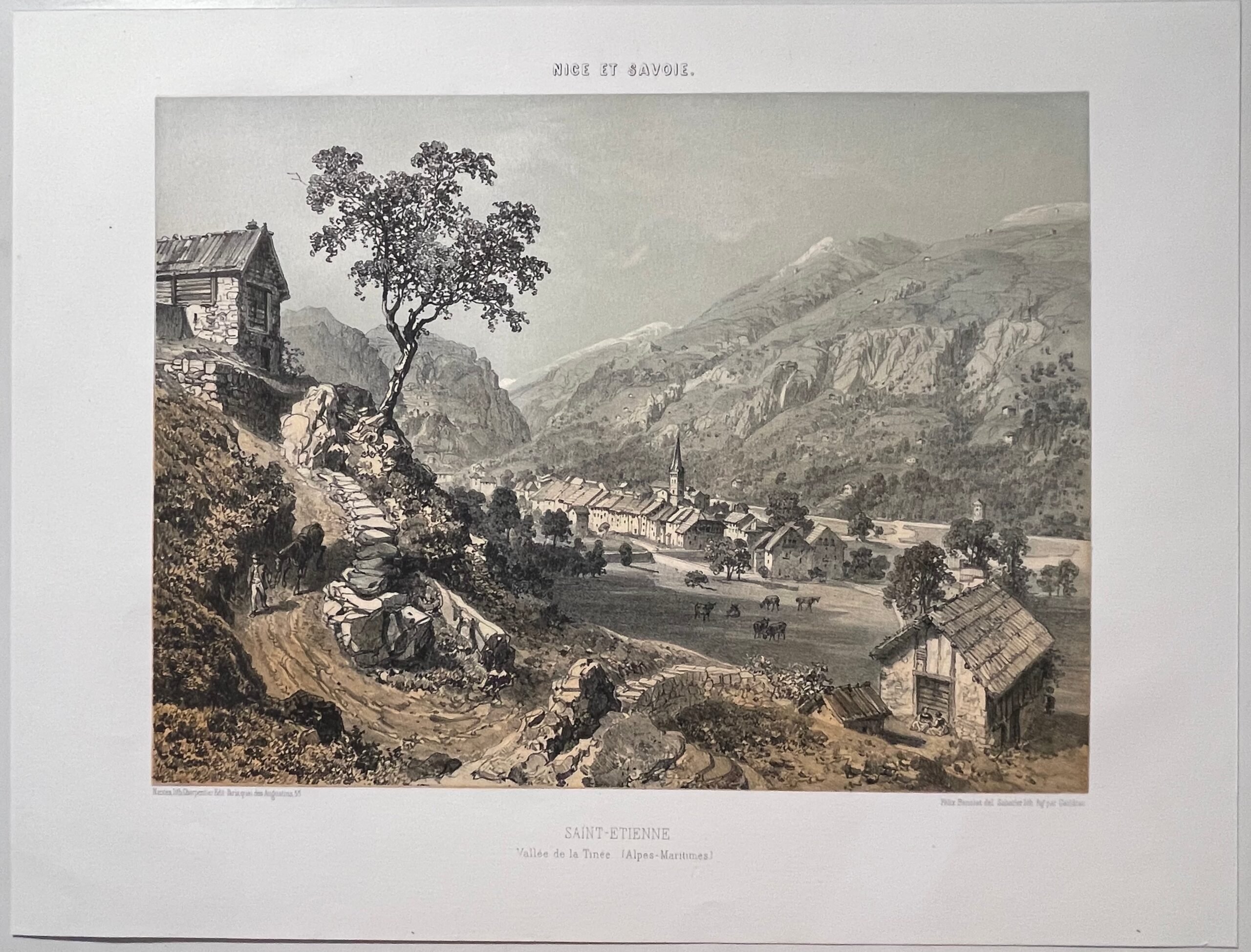 Je vous propose cette belle lithographie de 1864 représentant Saint-Étienne-de-Tinée, dans la vallée de la Tinée (Alpes-Maritimes), d’après Félix Benoist, issue de la série Nice et Savoie publiée vers 1864.