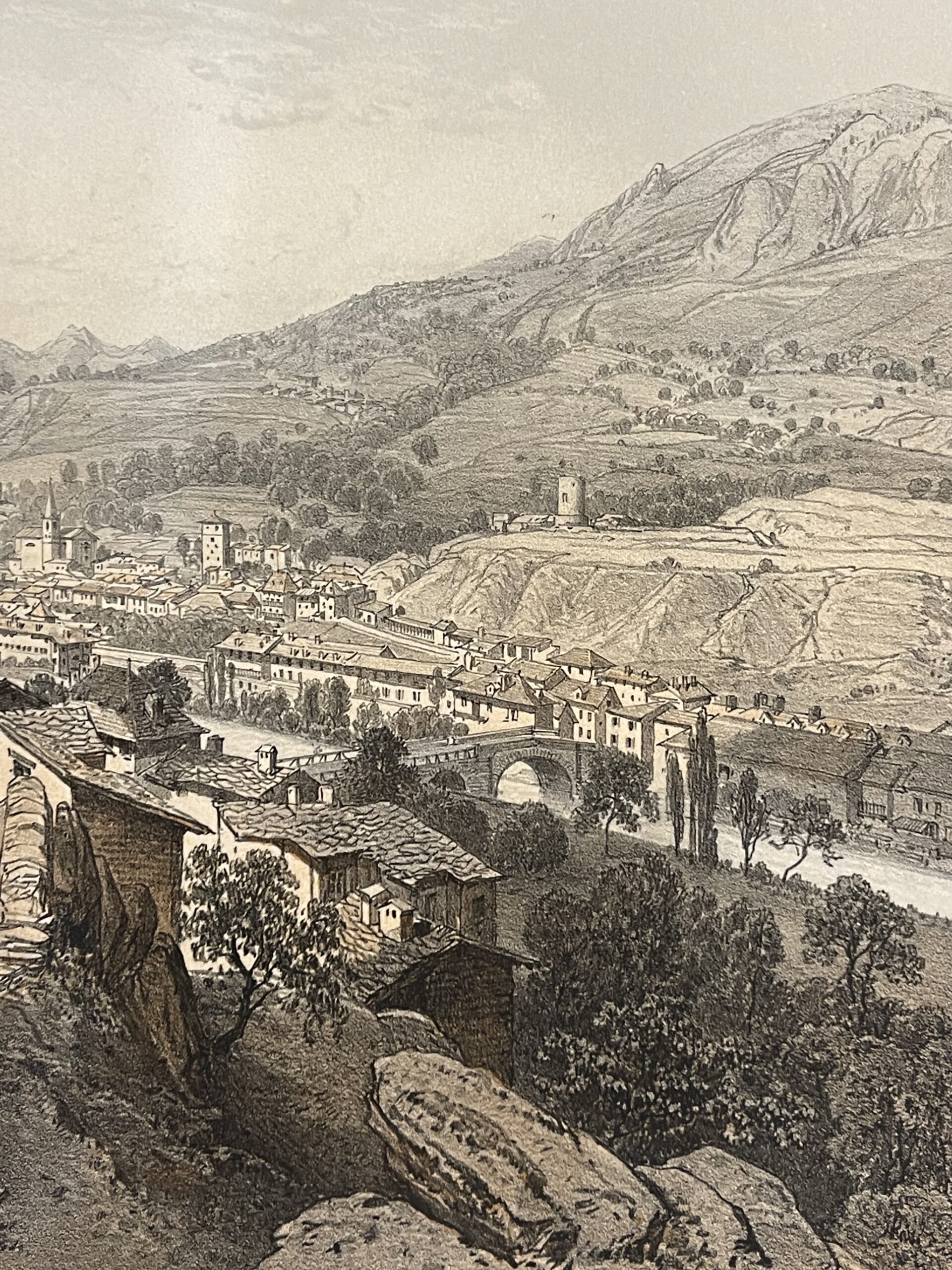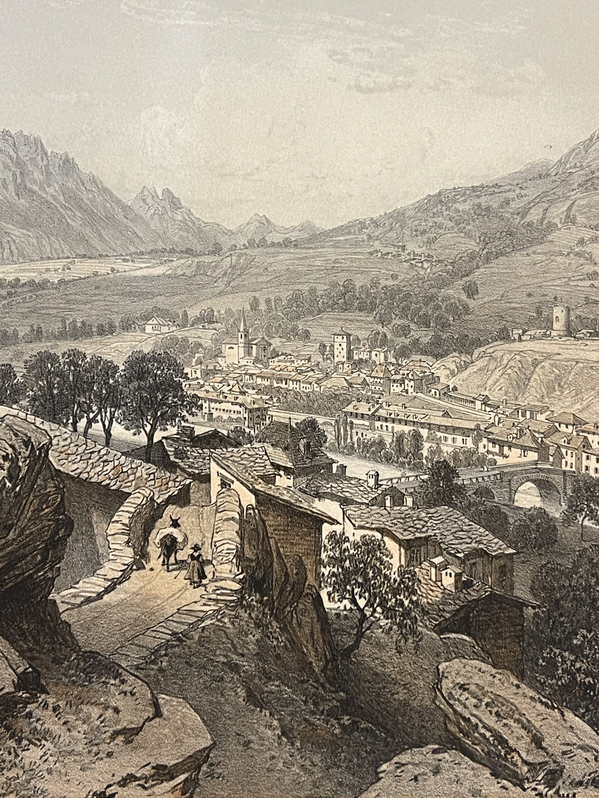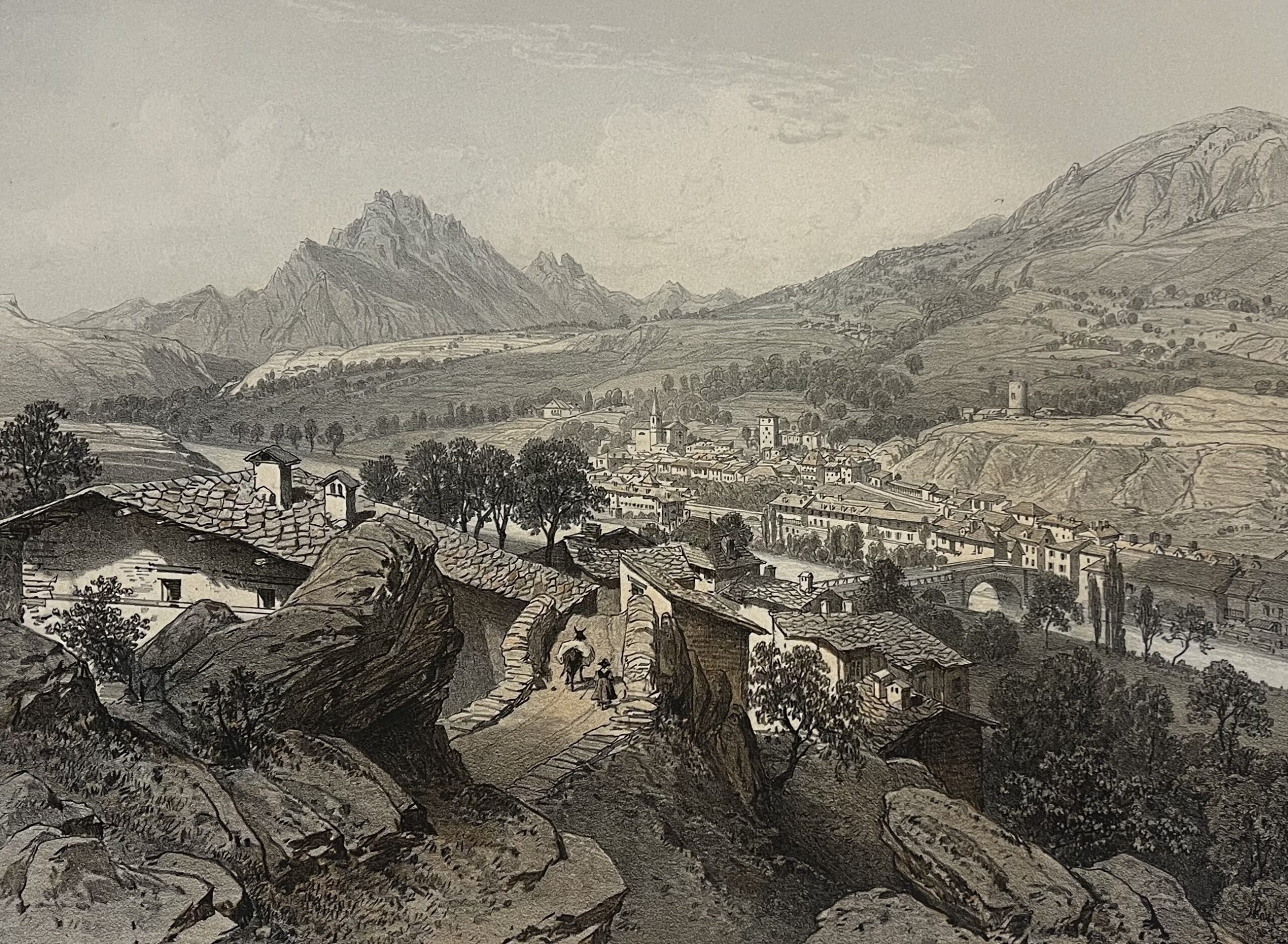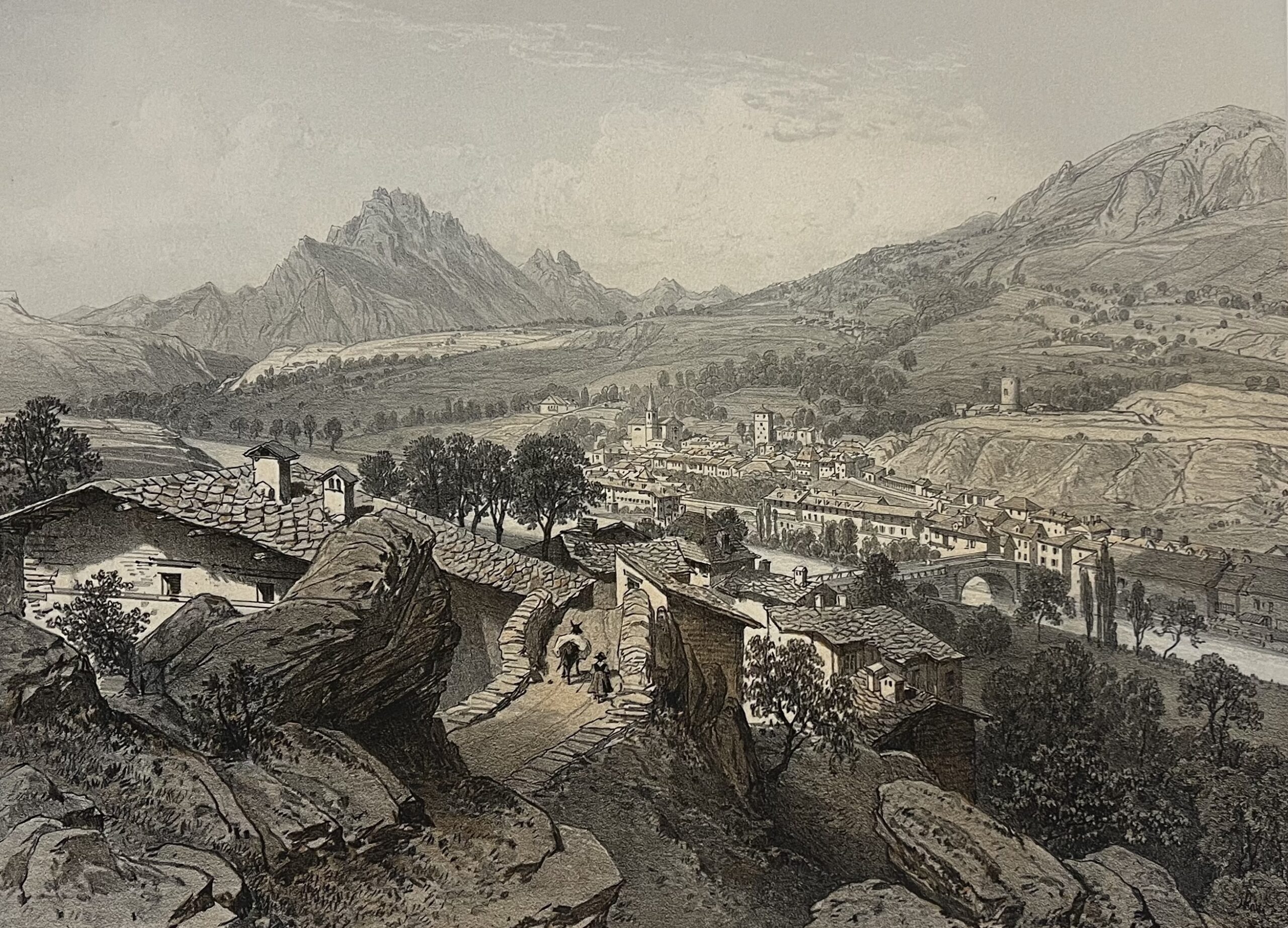 Cette vue de 1864, peu de temps après le rattachement de la Savoie à la France (1860) d’une grande finesse, nous présente un pittoresque village alpin niché au cœur des montagnes, avec ses chemins sinueux, ses maisons en pierre et une rivière traversant la vallée. Le point de vue surélevé offre une composition panoramique, alliant détails architecturaux et paysages naturels spectaculaires.