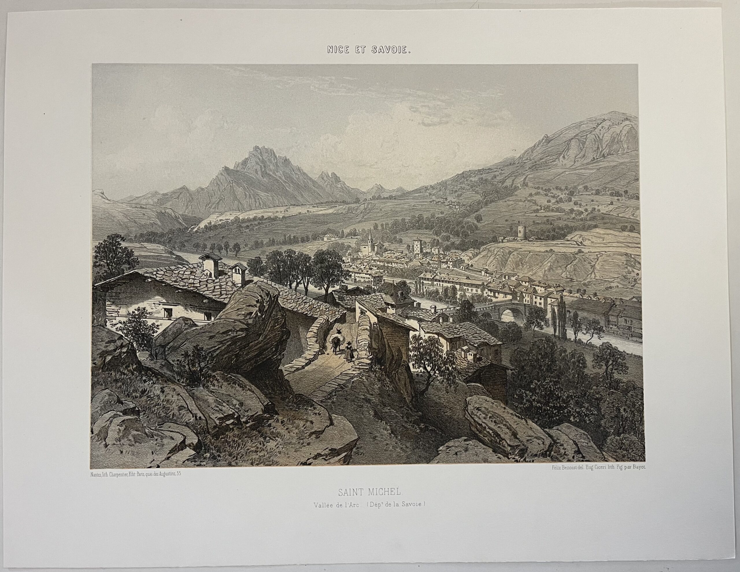 Je vous propose cette lithographie ancienne représentant Saint-Michel, village de Savoie, dans les Alpes françaises.