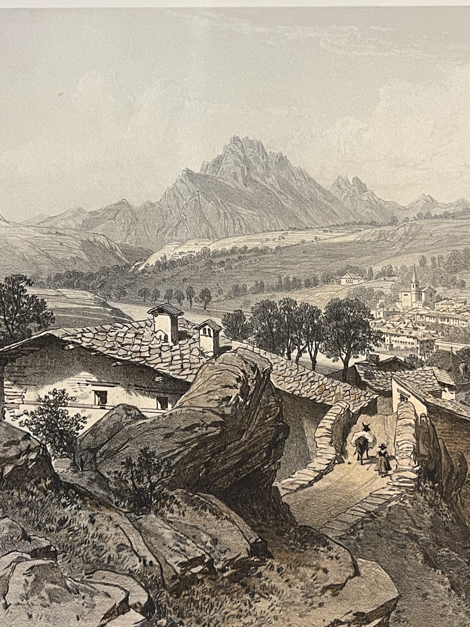 Une scène de village alpin classique, très décorative et recherchée par les collectionneurs de vues de montagne et d’estampes régionales françaises.