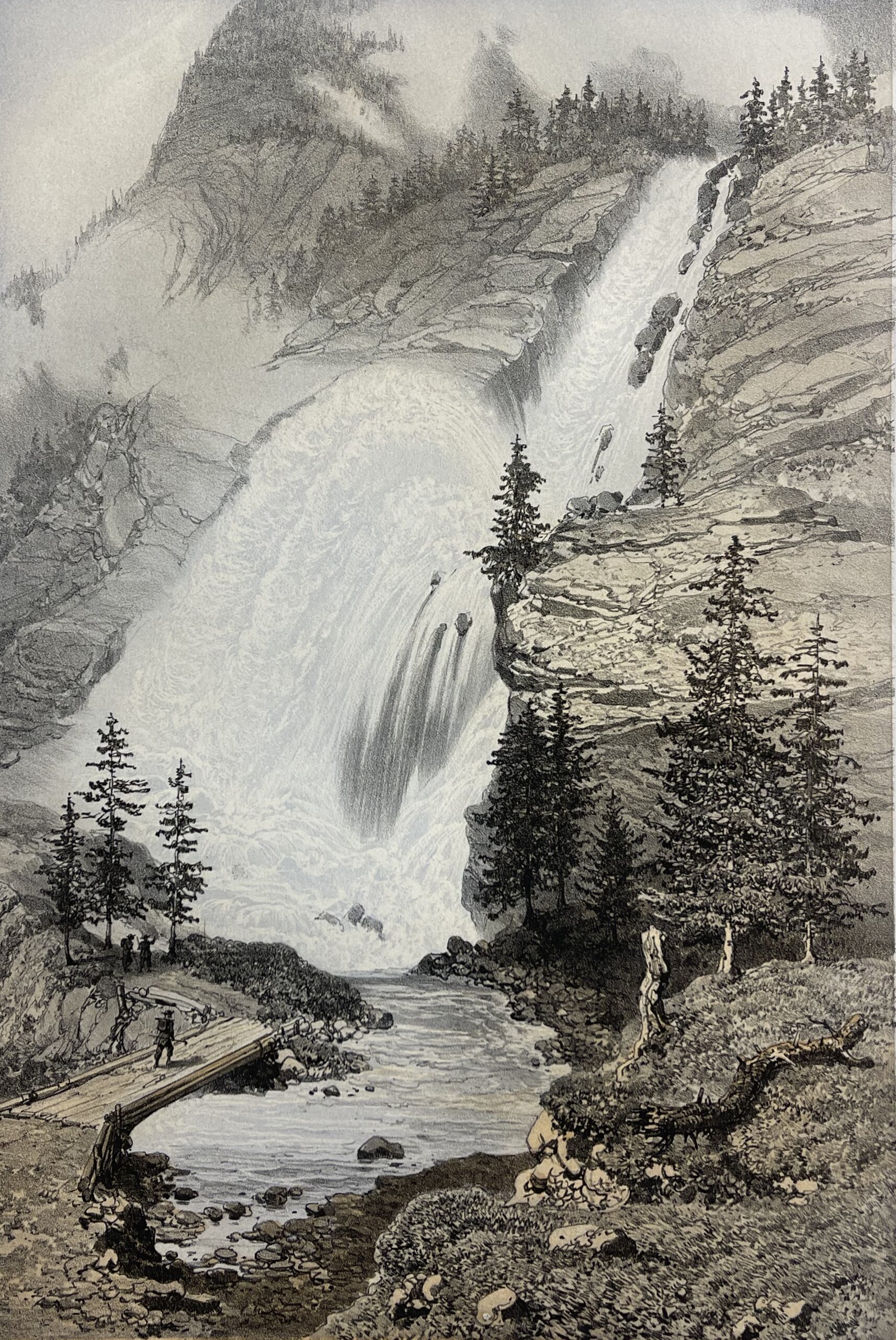 Publiée vers 1860, cette composition saisit la puissance dramatique de la cascade se jetant dans un paysage alpin rocheux, animé par de petits personnages qui soulignent l’échelle et la grandeur du site.