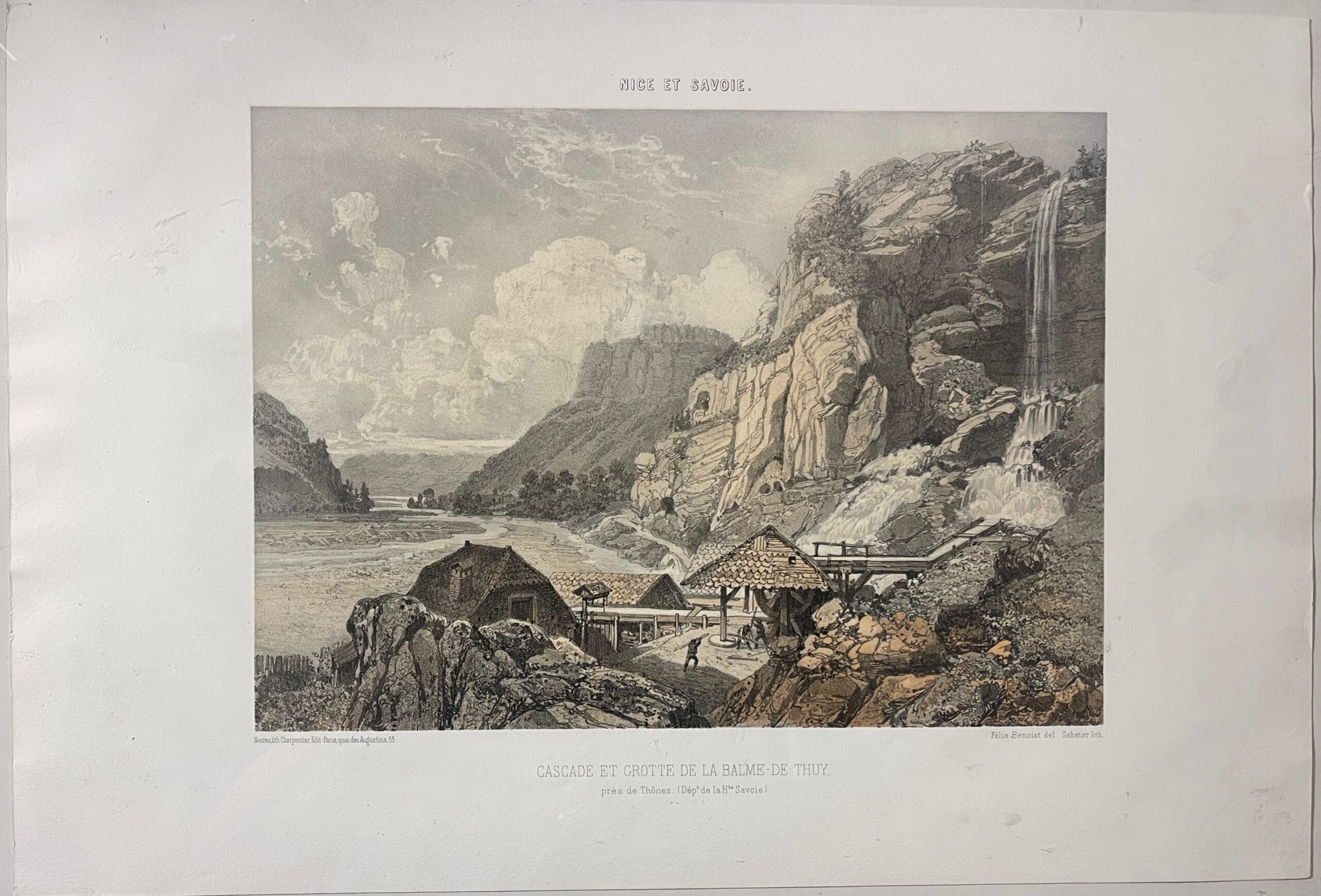Antique lithograph of La Balme-de-Thuy waterfall and cave, Haute-Savoie, from the Nice et Savoie series by Félix Benoist, circa 1864.
