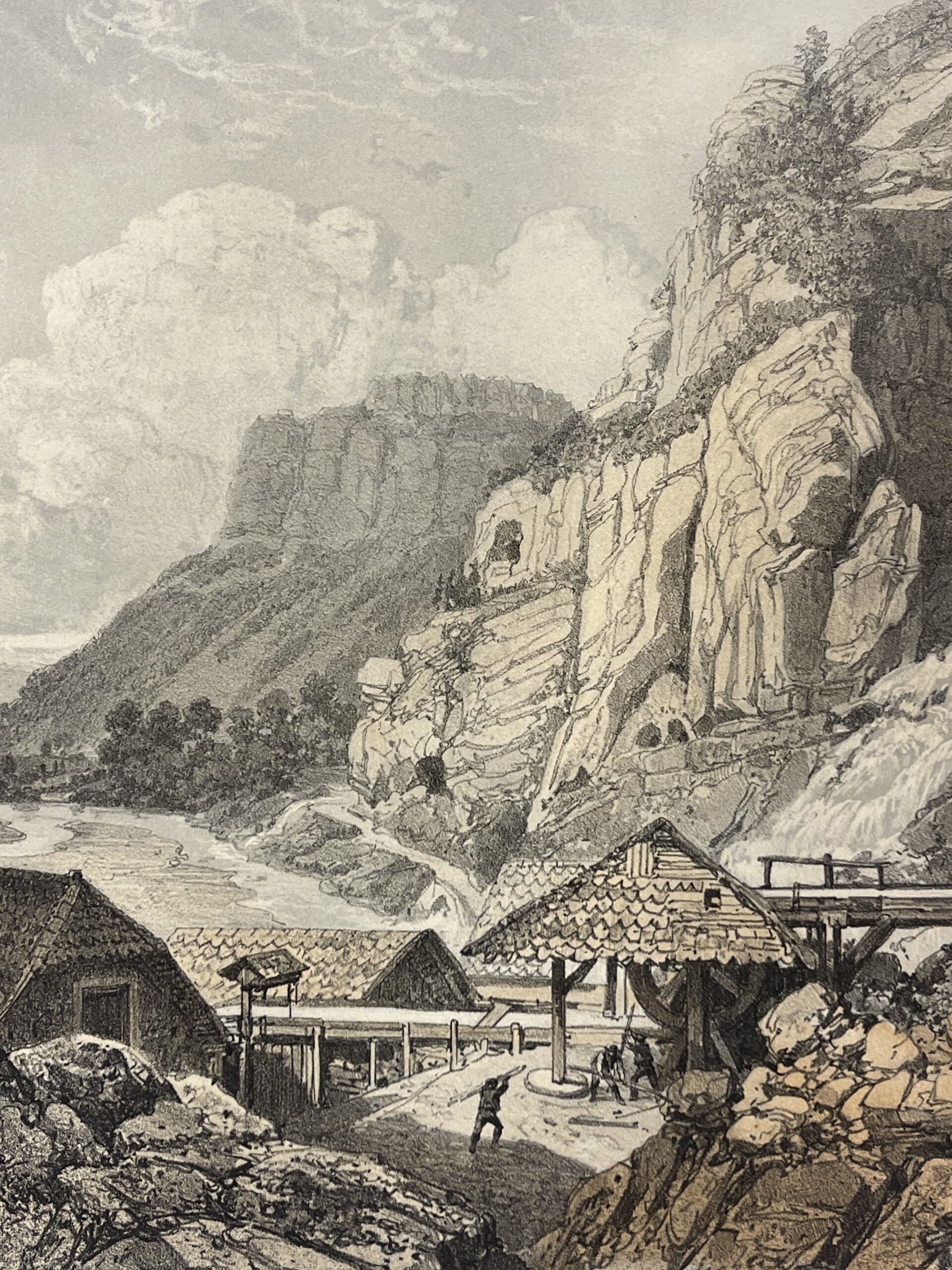 Cette composition saisissante représente la cascade et les formations rocheuses spectaculaires de la Balme-de-Thuy, près de Thônes en Haute-Savoie. La scène mêle falaises alpines escarpées, cascade, bâtiments ruraux et vaste vallée, illustrant à la fois la grandeur naturelle et la vie traditionnelle de la Savoie.