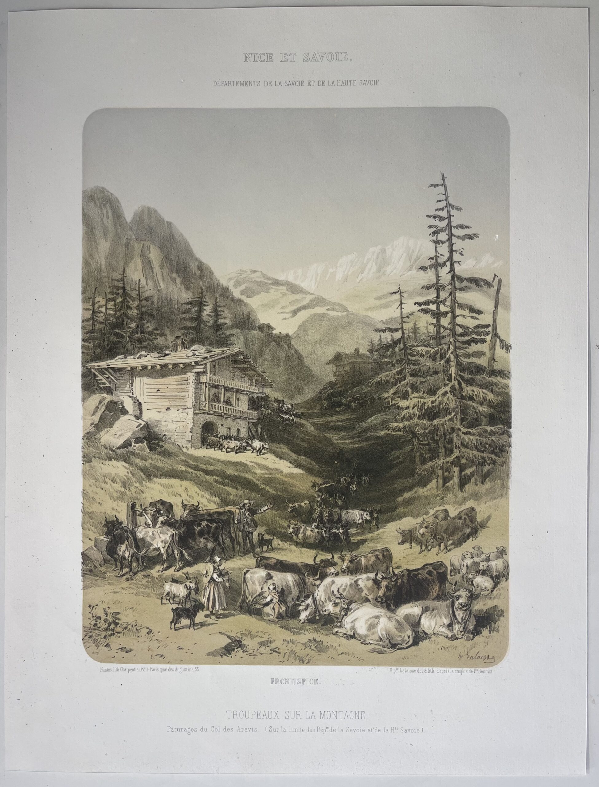 Scène pastorale au col des Aravis (Savoie), d’après Félix Benoist.Lithographie XIXe issue de Nice et Savoie.Très décoratif.