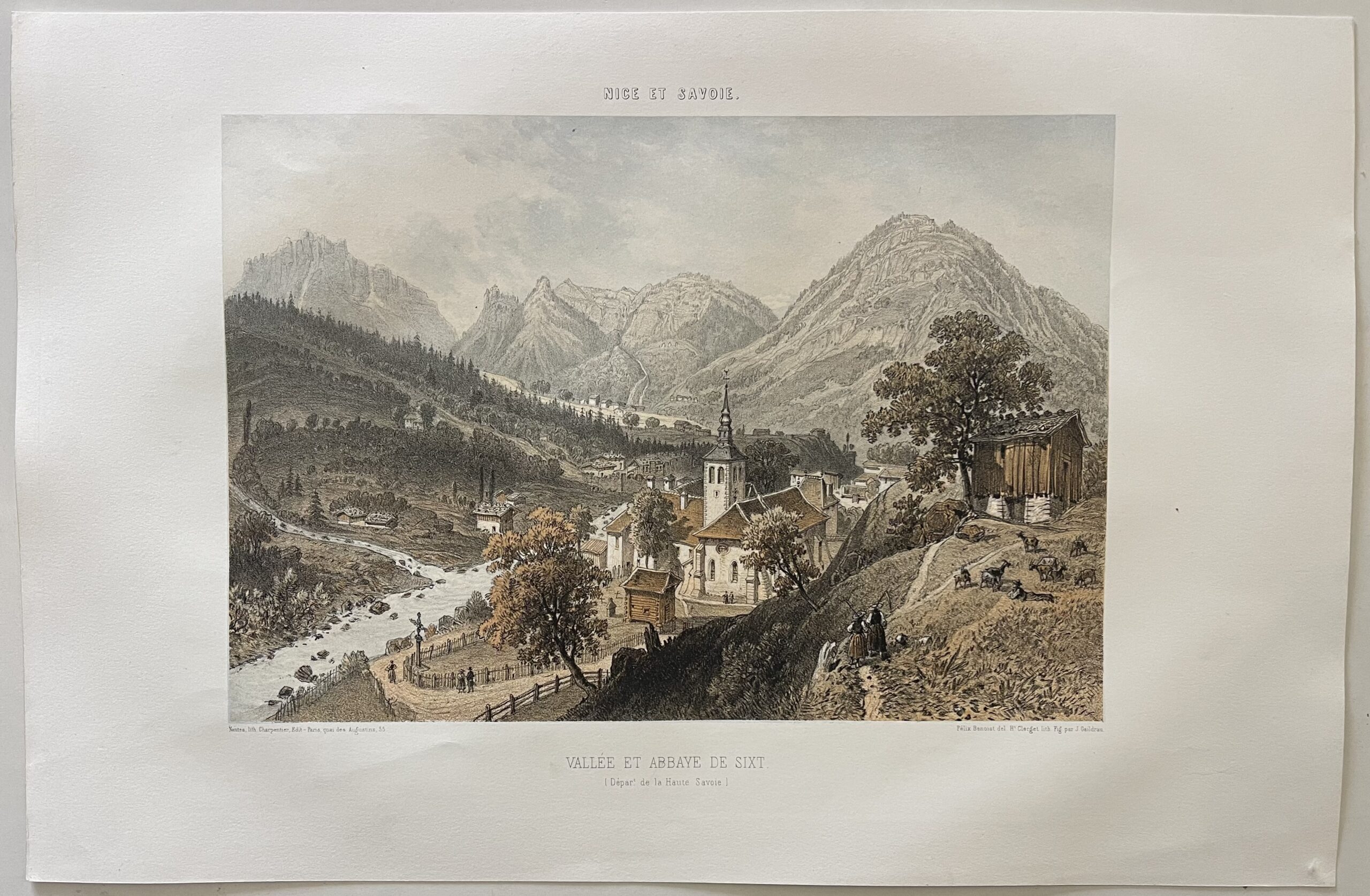 Je vous propose cette lithographie originale vers 1864 représentant la Vallée et l’Abbaye de Sixt (Haute-Savoie), réalisée d’après Félix Benoist.