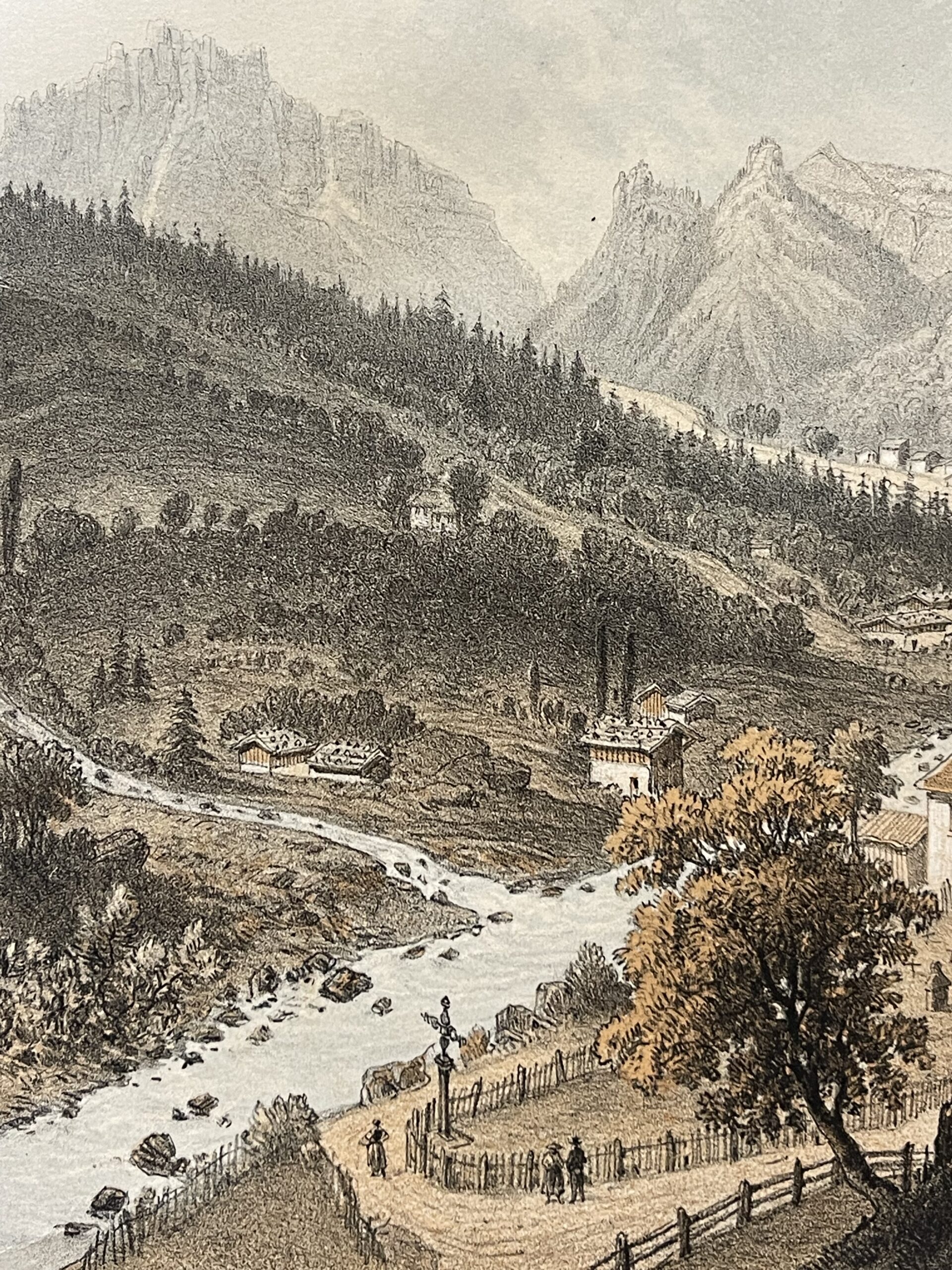 Le paysage est structuré autour de la vallée traversée par un cours d’eau, encadrée par des reliefs alpins puissants. Les scènes de vie rurales (personnages, habitations, animaux) enrichissent la composition et témoignent du regard pittoresque porté sur les Alpes à cette époque.